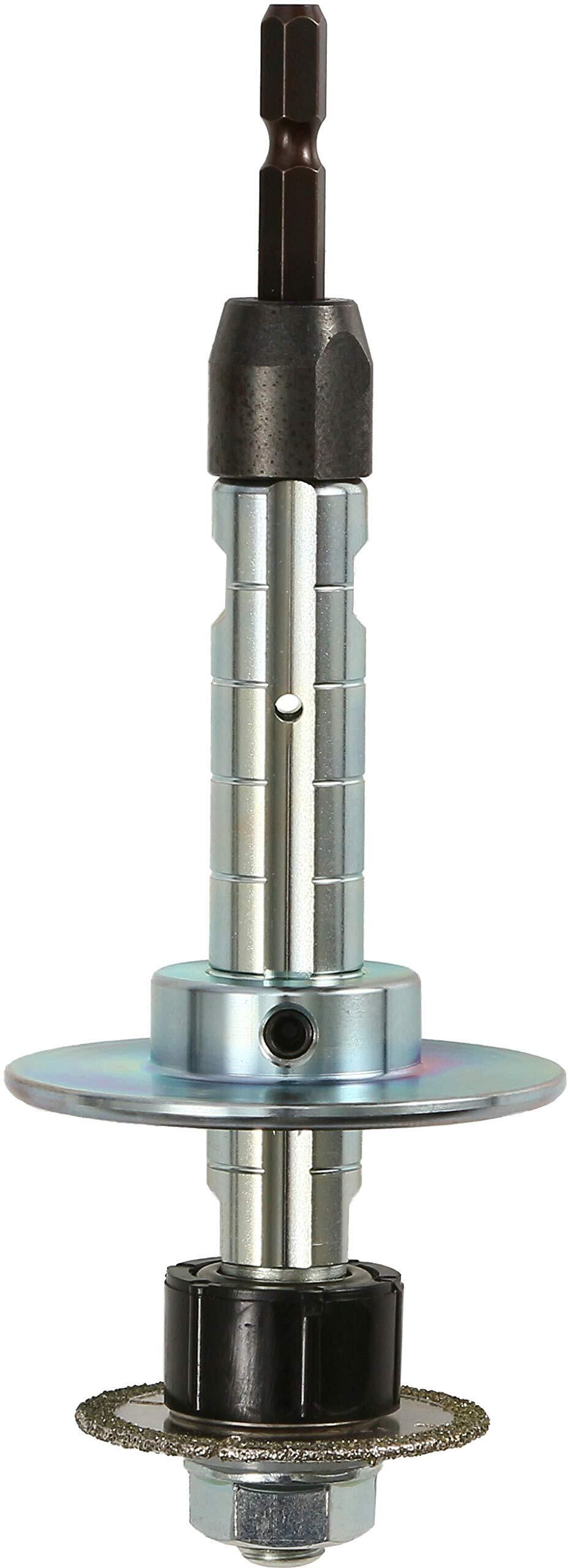 着脱式六角軸スピンドル(6.35mm)採用により、充電式インパクトドライバー(12V以上)、ディスクグラインダーに取り付け可能。 排水口の立ち上げ塩ビパイプを床面より低く切断。 ビニマスの立ち上がり筒を床面より低く切断。 立ち上げパイプの天端にそって平行切断するフランジガイドの採用。(切断深さ調節可能) 調節範囲:最小25mm~最大75mm ローラー採用で安定したスムーズな切断が行えます。 スリット入りコーティングダイヤモンド刃を採用していますので、コンクリート埋設部の塩ビ管切断作業もスムーズに行えます。 Φ43ダイヤモンド刃で、塩ビパイプの切断能力向上。