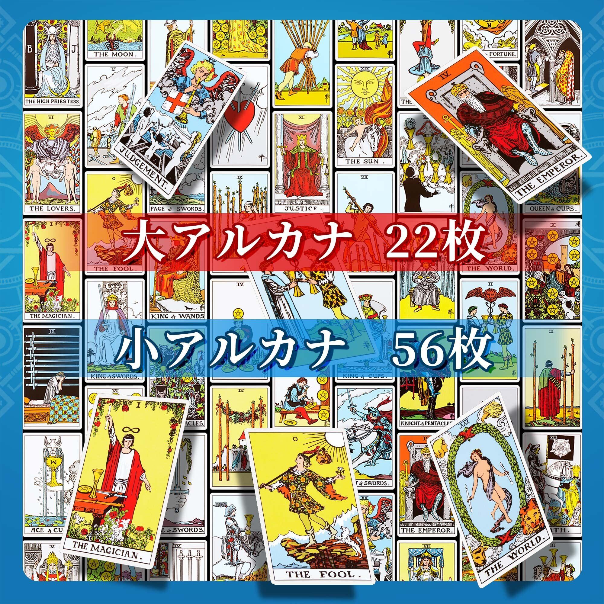 サイズ: カード:7cm×12cm 日本語解説書: 8cm×12.6cm カード枚数:78枚 (大アルカナ22枚 小アルカナ56枚)