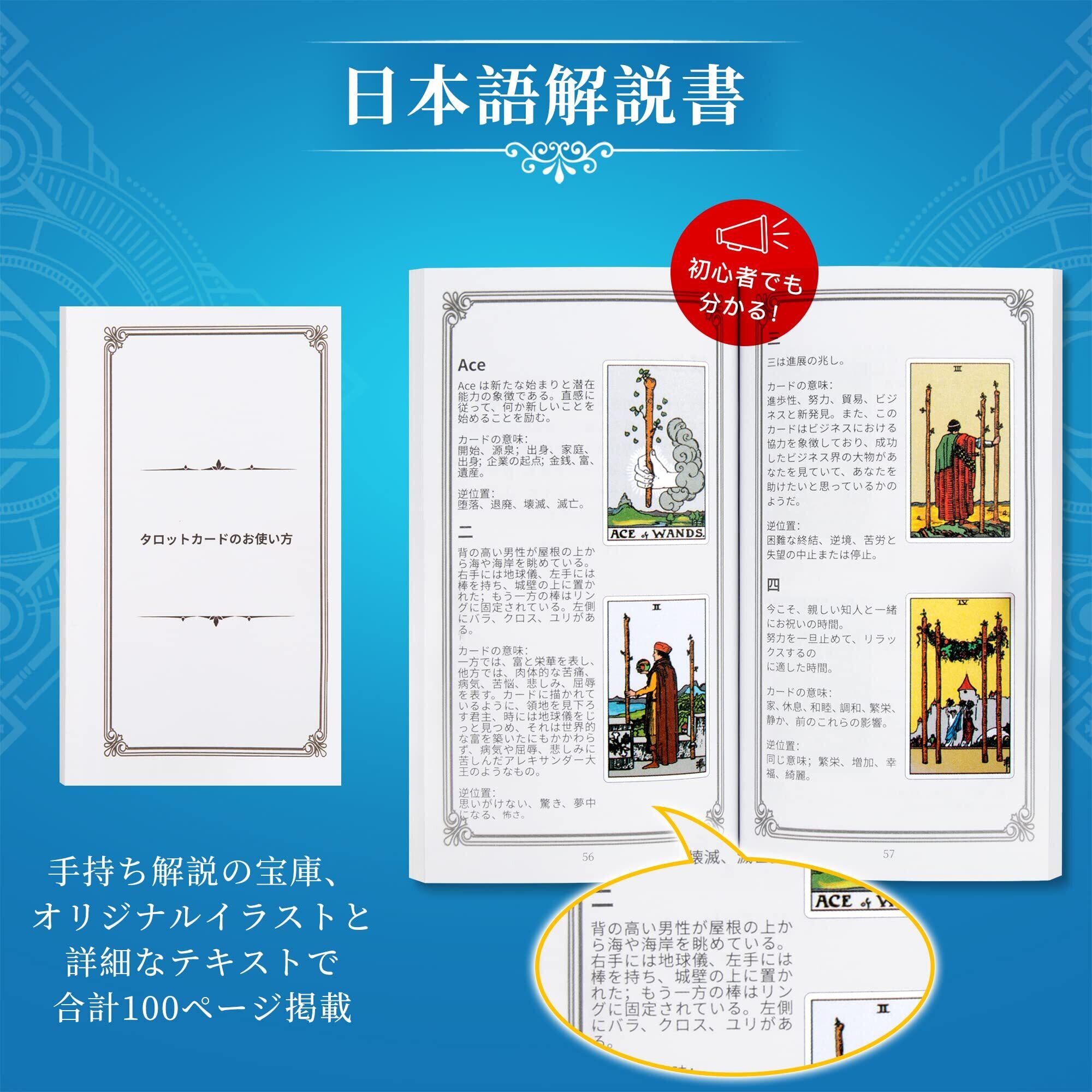 日本語解説書: カードの絵柄やタロットカードの使い方を詳しく解説した日本語の解説書も付属しているので、初心者の方でも大丈夫です。 「解説書の翻訳がひどい」というコメントに対して、解説書を再翻訳した。
