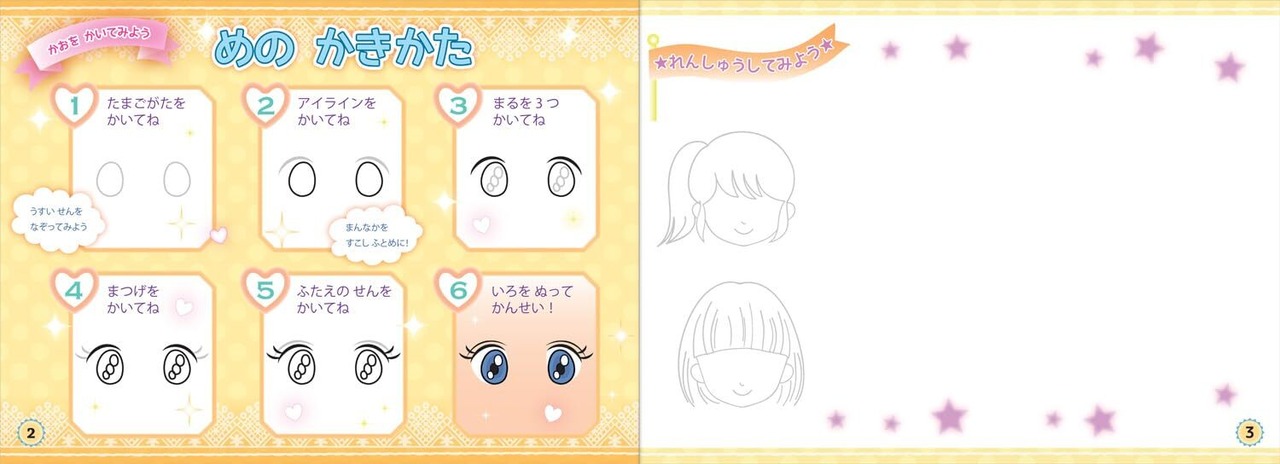 ロングやツインテールなどのかわいい髪型や、ウインクやプンプンした表情のおかおまで、じょうずになるコツを教えてくれます。