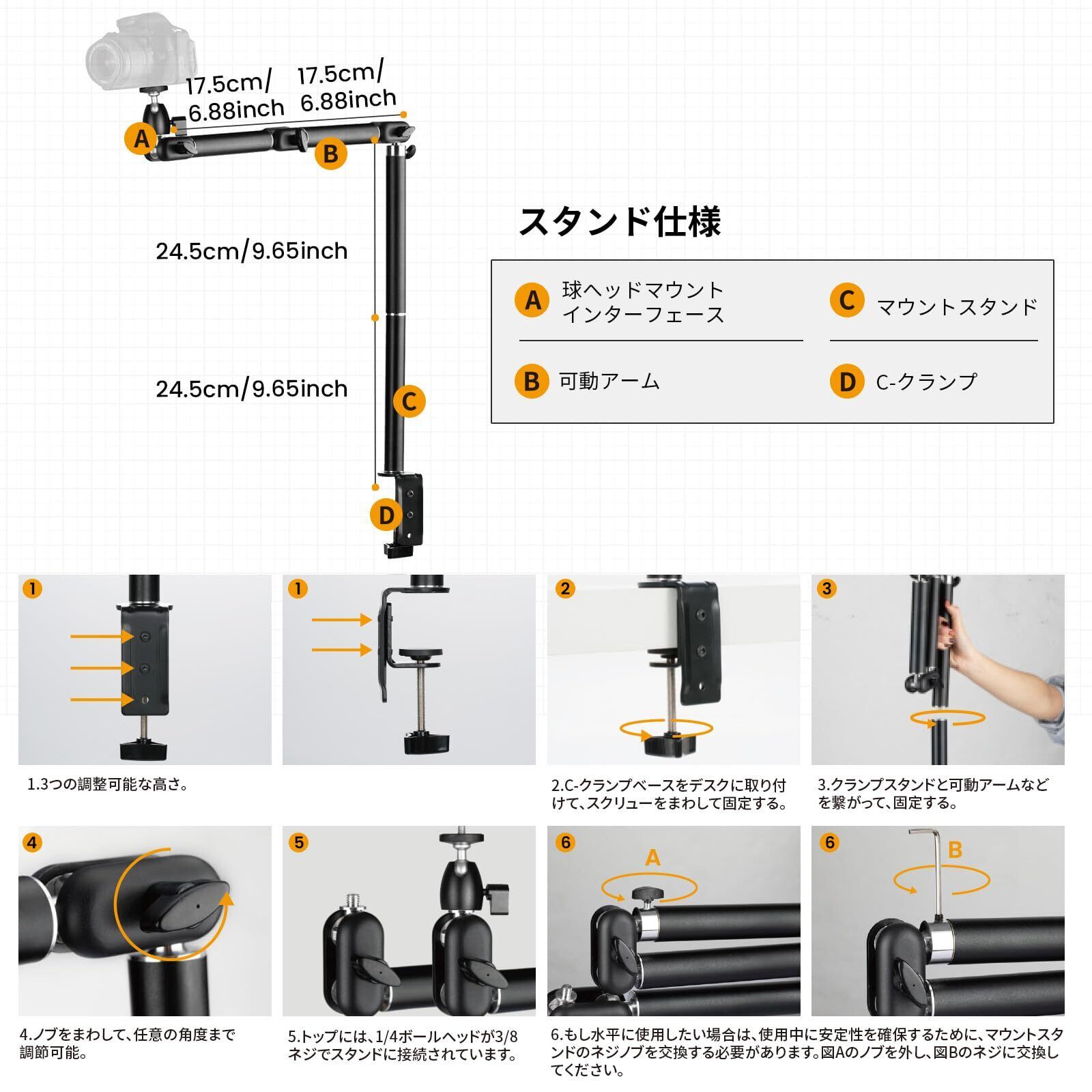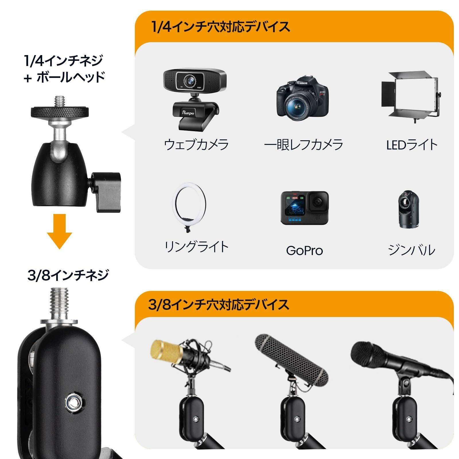 【汎用】カメラアームには3/8ネジが内蔵、雲台や一眼レフカメラなどに対応します。付属の3/8"→1/4"ネジアダプターで、1/4"ネジに変わり、ボールヘッド、カメラ、リングライト、Webカメラ、プロジェクターなど様々なデバイスと交換可能です。