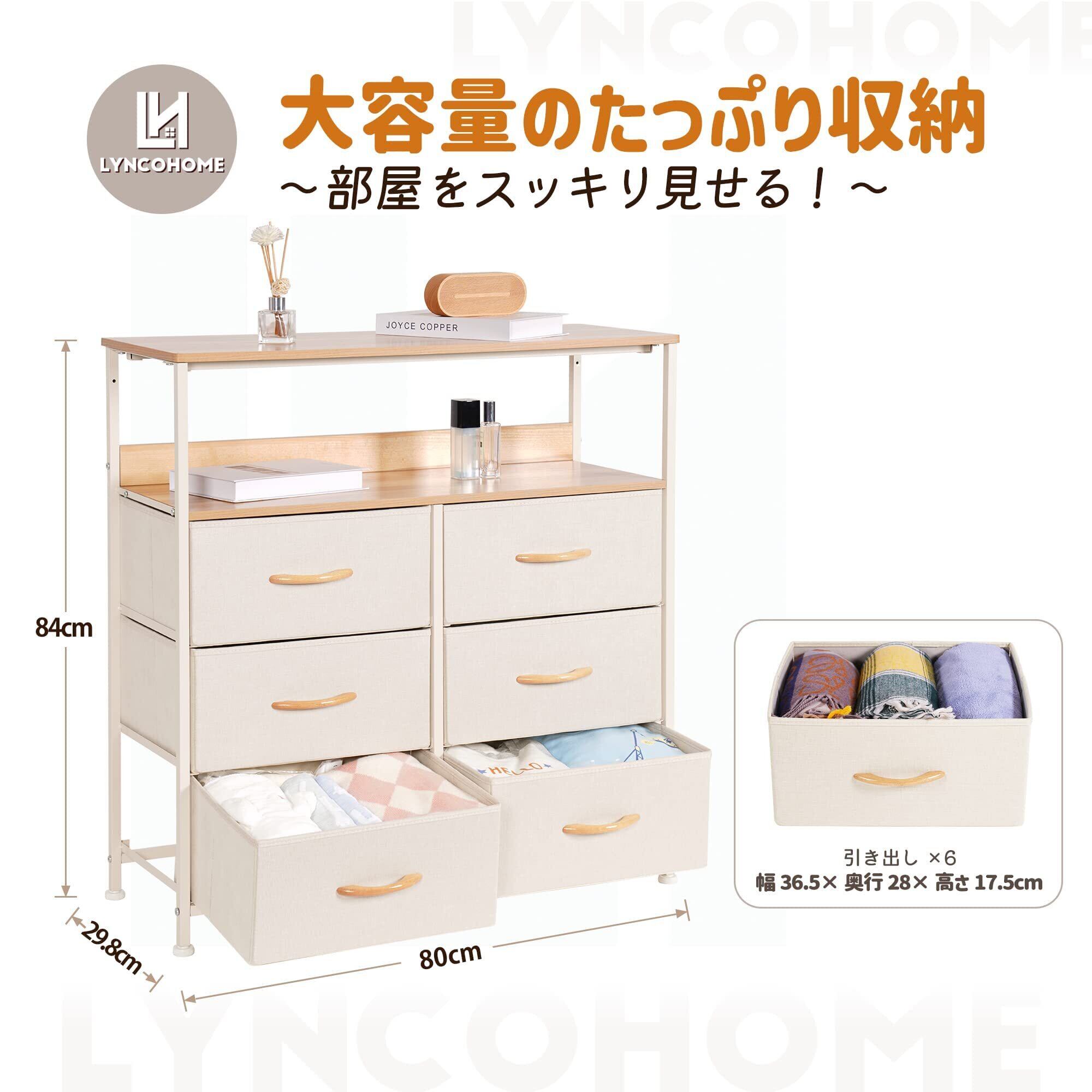 LYNCOHOME 棚付き収納チェスト タンス ベージュ 布製引き出し 衣類収納 カラーボックス キャビネット おもちゃ箱 一人暮らし 3段6杯【幅80×奥行30×高さ84cm】