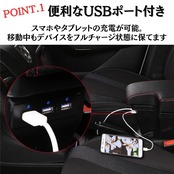 ◆【便利なUSBポート】アームレストに組み込まれたUSBポート(1インプット、2アウトプット)で、スマートフォンやタブレットの充電が可能。移動中もデバイスをフルチャージ状態に保てます。