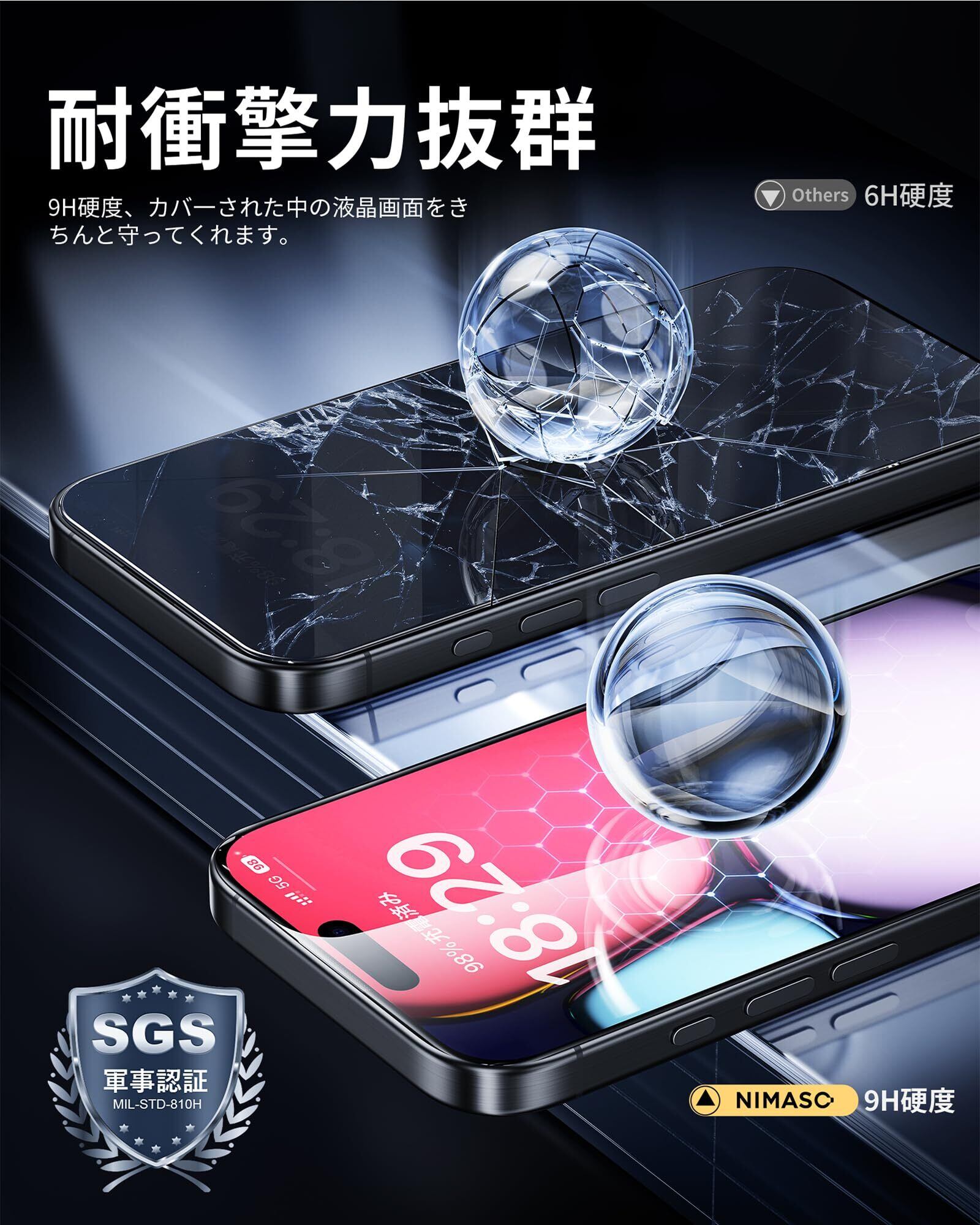 「9H硬度・飛散防止」米軍規格「MIL-STD-810H」に準拠(認証番号:SZXEC23002005001)。9H硬度のガラスを採用。小刀や鍵などの鋭いものにぶつかっても傷が付きにくく、アイホン16プロマックスをしっかり保護します。飛散防止加工により、万一割れてもガラス破片が飛び散ることなく安心です。