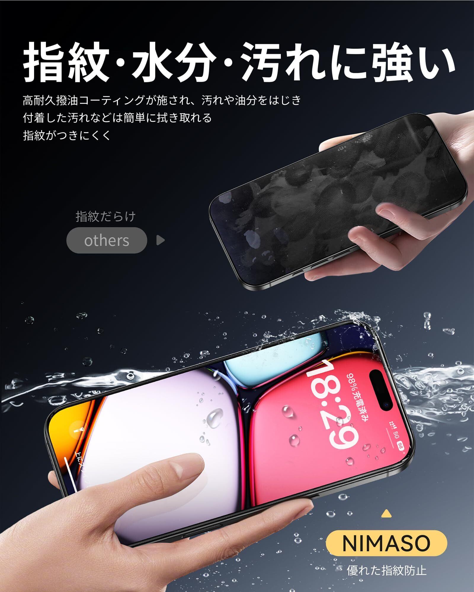 「指紋防止・滑らかな触り心地」本製品は撥水撥油のAF(Anti-Fingerprint)コーティング加工とスムーズタッチ加工により、指紋や汚れがつきにくく、油分や水分が強く付着した汚れや指紋がついても、拭き取るだけで綺麗になれます。また、使用時の手触りも滑らかで、毎日のドラマ視聴やオフィス仕事、ゲームなどの邪魔になりません。常に美しいあいふぉん16ぷろまっくすの画面をお楽しみいただけます。