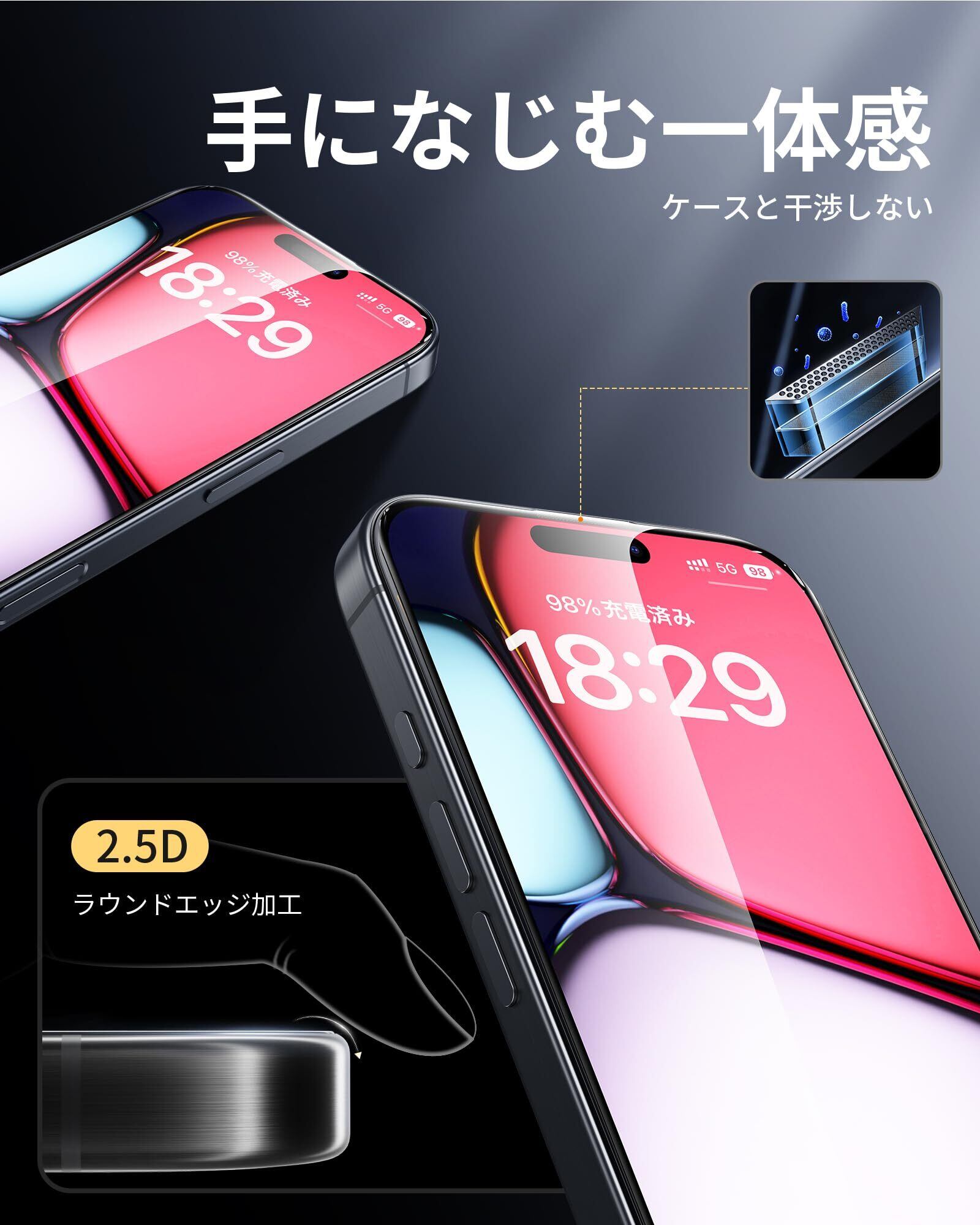 「黒縁全面保護・防塵ネット付き」黒縁取りでスマートフォンの画面をフルカバーして、落下や衝撃による損傷からスマートフォンを守ります防塵ネット設計で、受話器を防塵できるとともに、電話や音楽などの音量への影響を与えません。