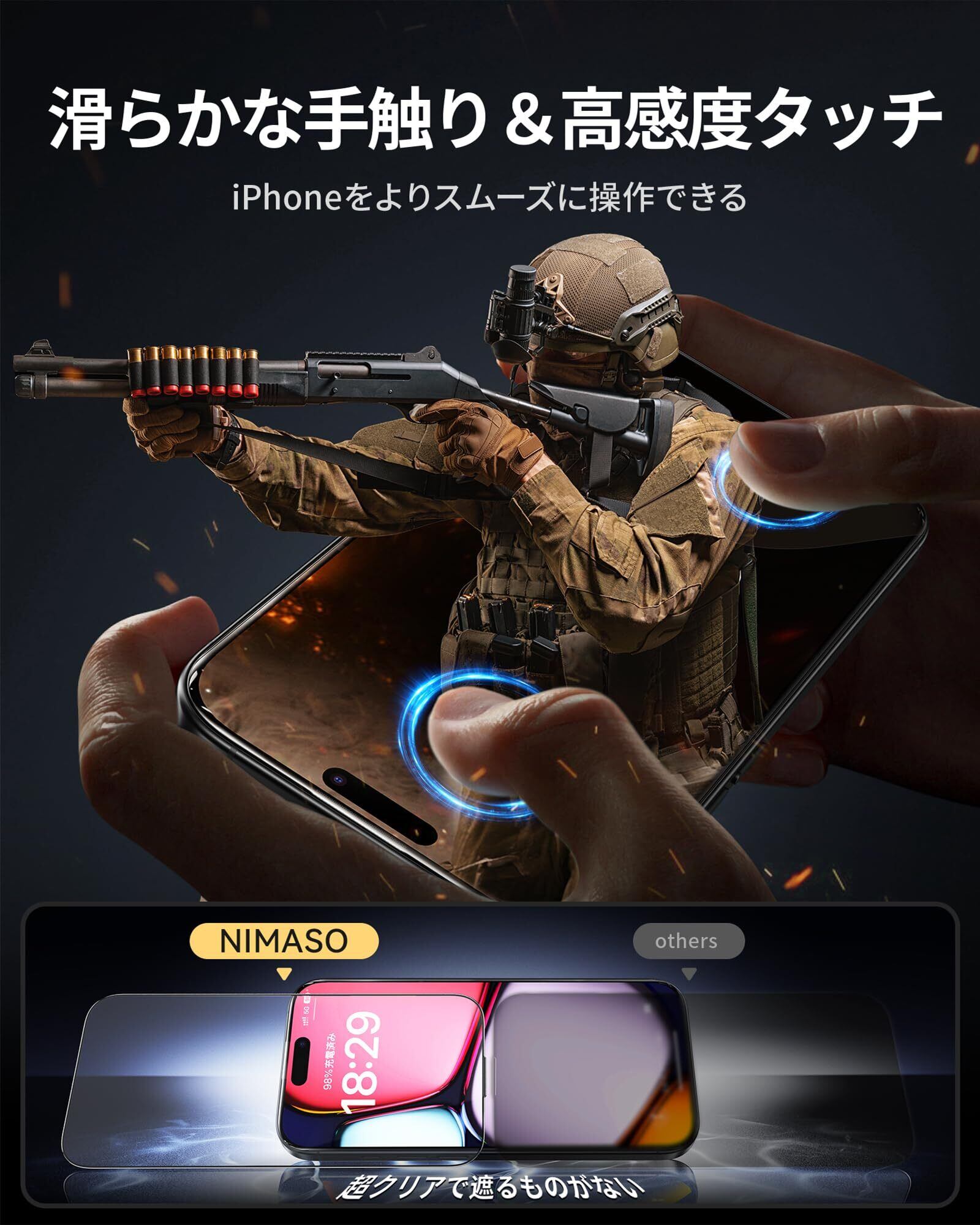 「高感度タッチ・99%透明度」厚みは約0.25mm。薄いため装着後の違和も少なく、タッチ感度も従来より向上しました。透明度が高く、iphone16 pro max画面そのままの美しさを保ちます。さらにガラスフィルムを貼っていないかのような触り心地です。