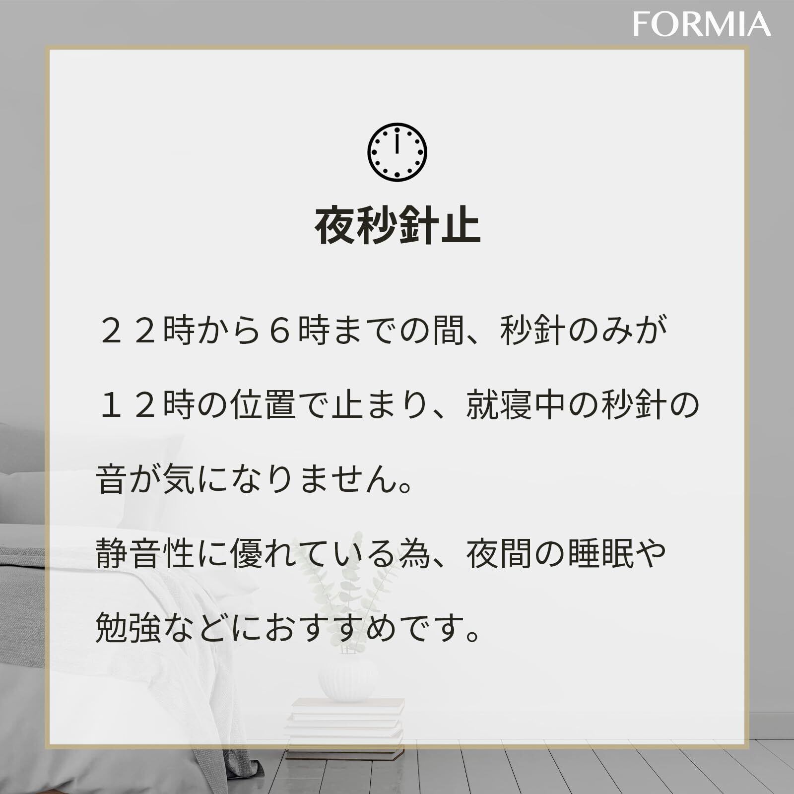 22時から6時までの間、秒針のみが12時の位置で止まり、就寝中の秒針の音が気になりません。静音性に優れている為、夜間の睡眠や勉強などに。