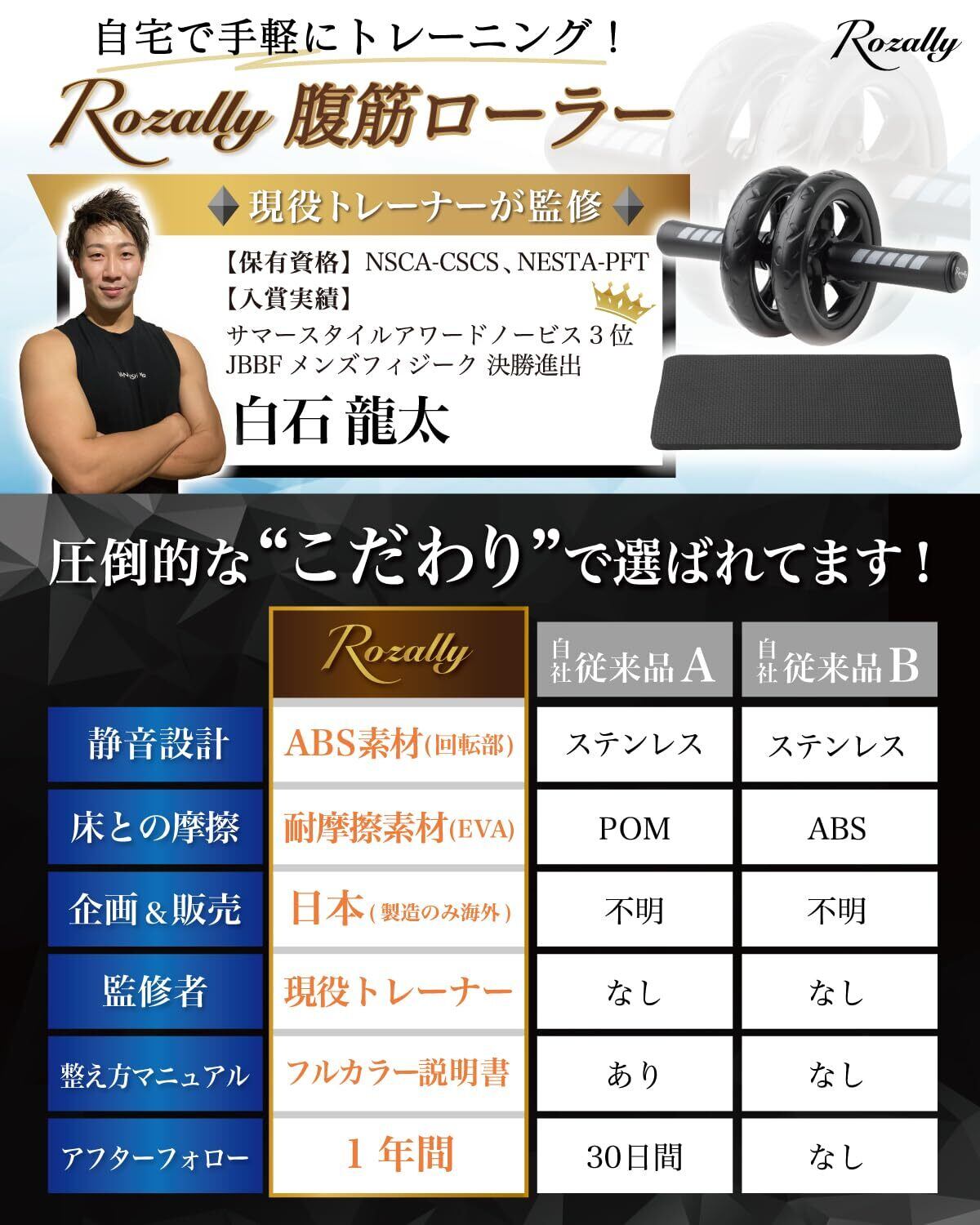 【こだわり】様々なから” 腹筋ローラー ”や” アブローラー ”として 筋トレ 用の商品が販売されていますが、Rozallyの腹筋ローラーは”静音性能”と”使いやすさ”が一味違います。トレーニング用品 をメインに取り扱っている10社以上の工場からサンプルを取り寄せ、「強度と形状」や「摩擦や静音設計」を一緒に試行錯誤して頂けた1社に絞って発注を行なっています。家トレ で 腹筋 をしっかり鍛えるけるアイテムとして コンパクト かつ 簡単組み立ての 筋トレ グッズ になります。