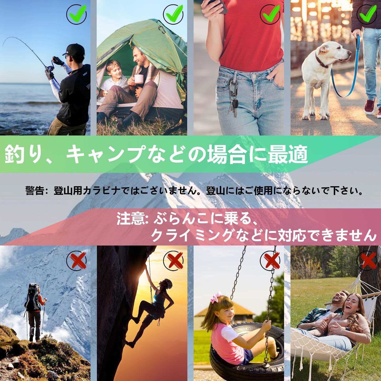 カラビナはテントやタープ設営時、簡単に装着でき、強い風でも破損する事無くしっかり使えています。本大型 カラビナは登山、クライミング用途では使用できませんのでご注意ください。
