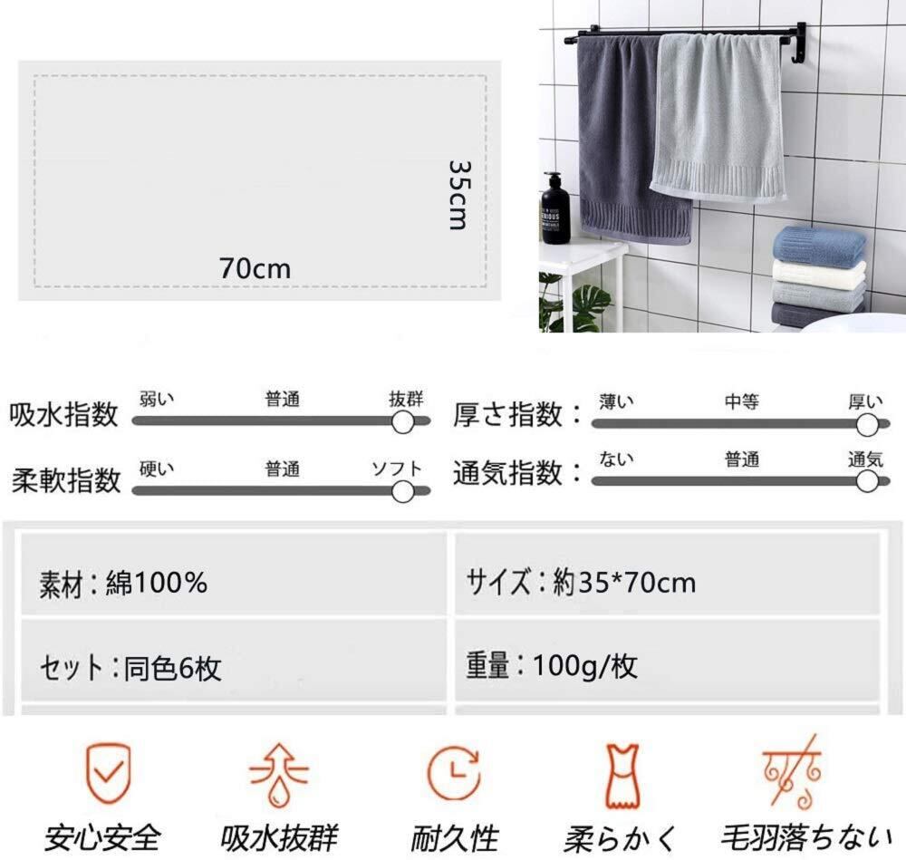 【フェイスタオル 6枚セット】素材:綿100%、サイズ:約35×70cm、重さ:約100g(1枚)、セット内容: グレー 6枚。