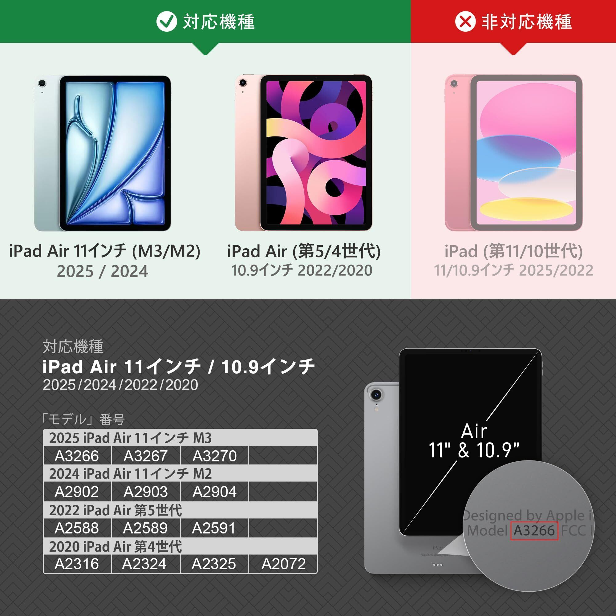 【対応機種】2025年発売の ipad Air 11インチ M3 (型番:A3266・A3267・A3270)、 2024年発売のipad Air 11インチ M2 (型番:A2902・A2903・A2904)、2022年発売の ipad Air 第5世代 10.9 2022モデル(型番:A2588・A2589・A2591)、2020年発売の ipad Air 第4世代 10.9 2020モデル(型番:A2324・A2325・A2072・A2316) のために設計されています。 ️ご注意:ご購入する前にはiPad背面に記載されている「モデル」番号をご確認してください。