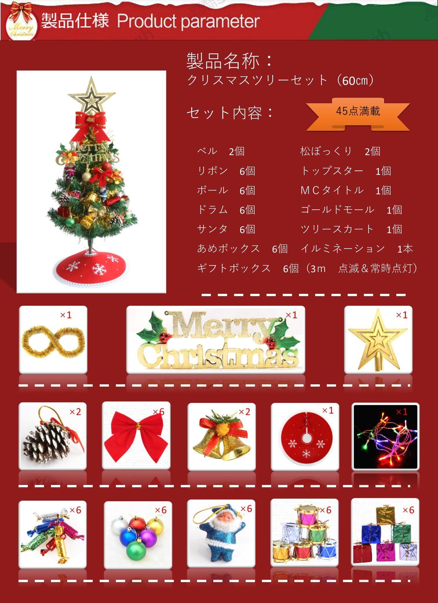 Sutekus 卓上 クリスマス ツリー 電飾つき セット かわいい ミニ サイズ 60cm オーナメント 玄関に 飾り ウェルカムツリーにも インテリア 用品 プレゼントに最適