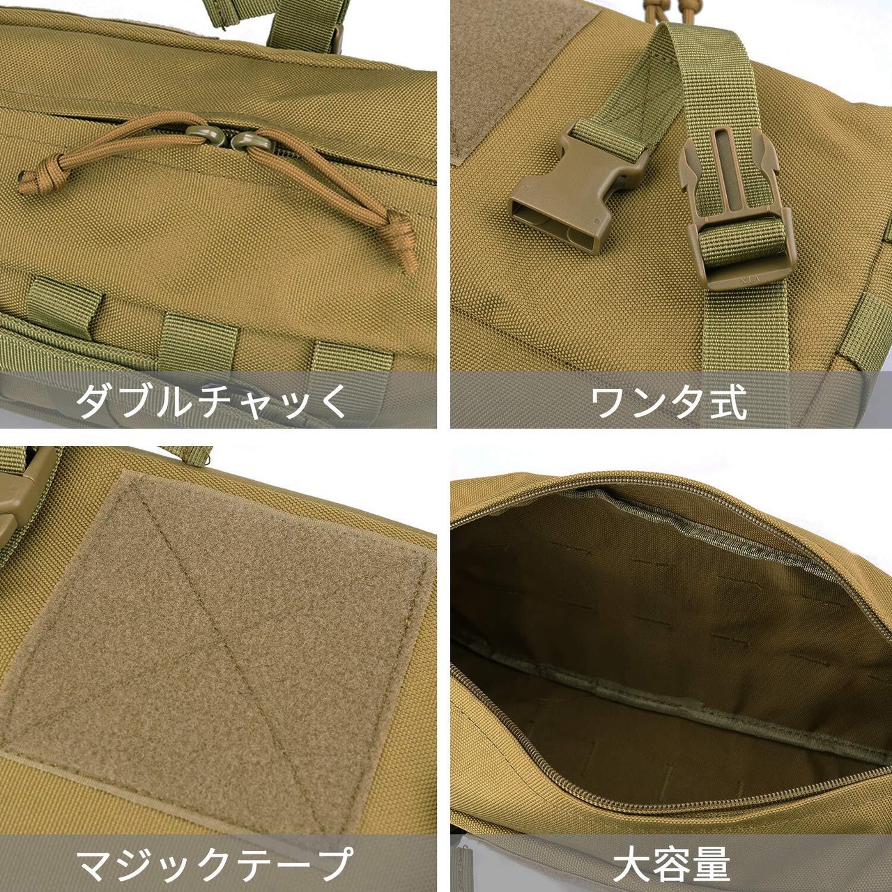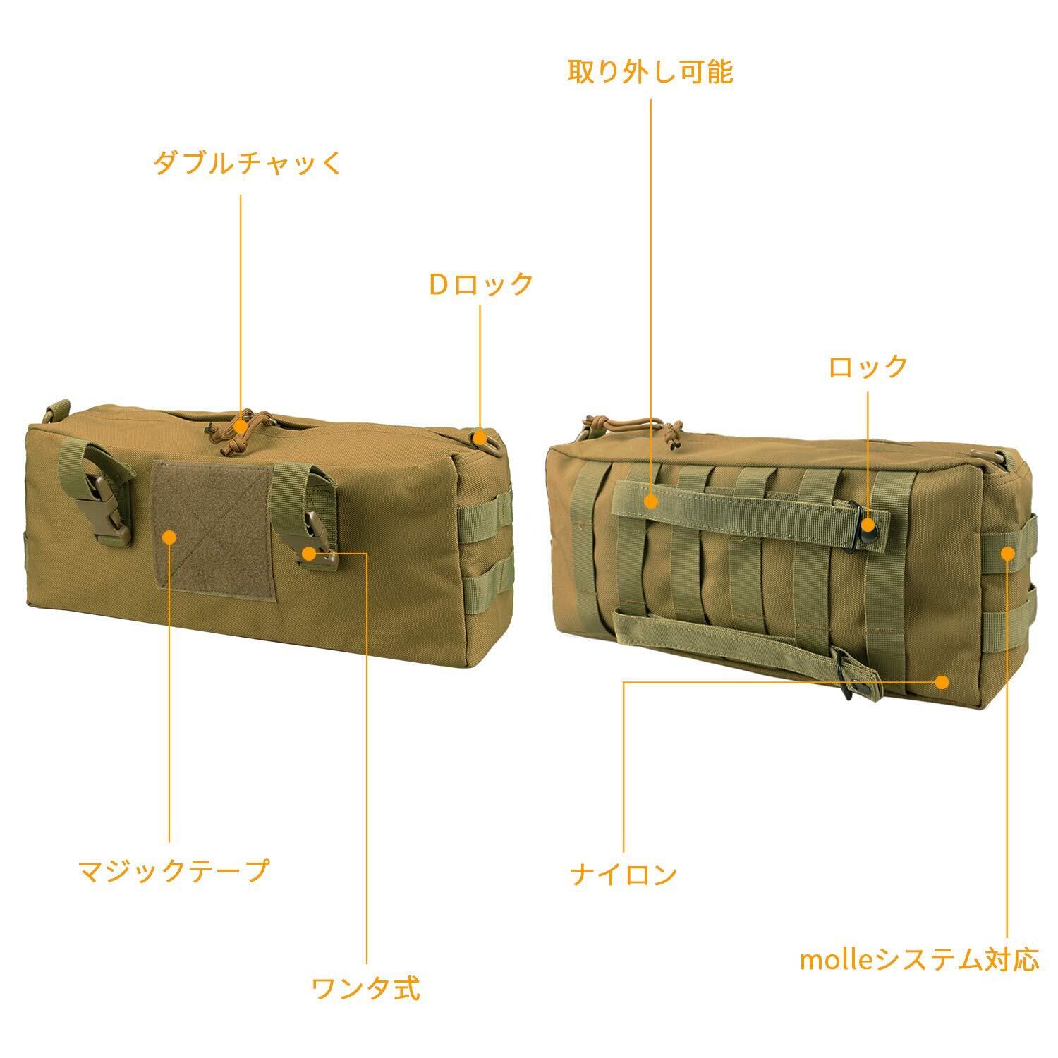 かなり大容量で色々と収納する事ができます、ウエストバッグとしはもちろん、MOLLE対応のバッグやサバゲーベスト等に装着するのも可能な品物です。