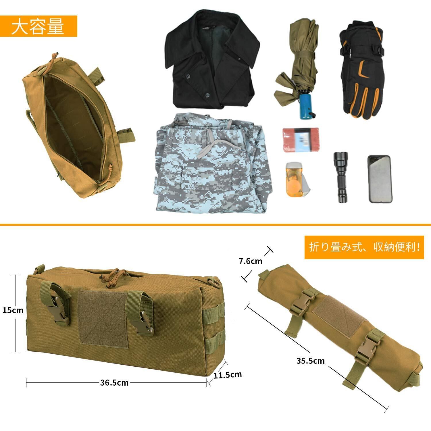 【MOLLEシステムでカスタマイズ自由】MOLLEウェビングが搭載されており、追加のポーチやアクセサリーを簡単に取り付けることができます。自分だけのオリジナルの収納を実現し、必要なアイテムをすぐ手に取れる快適さを実感してください。