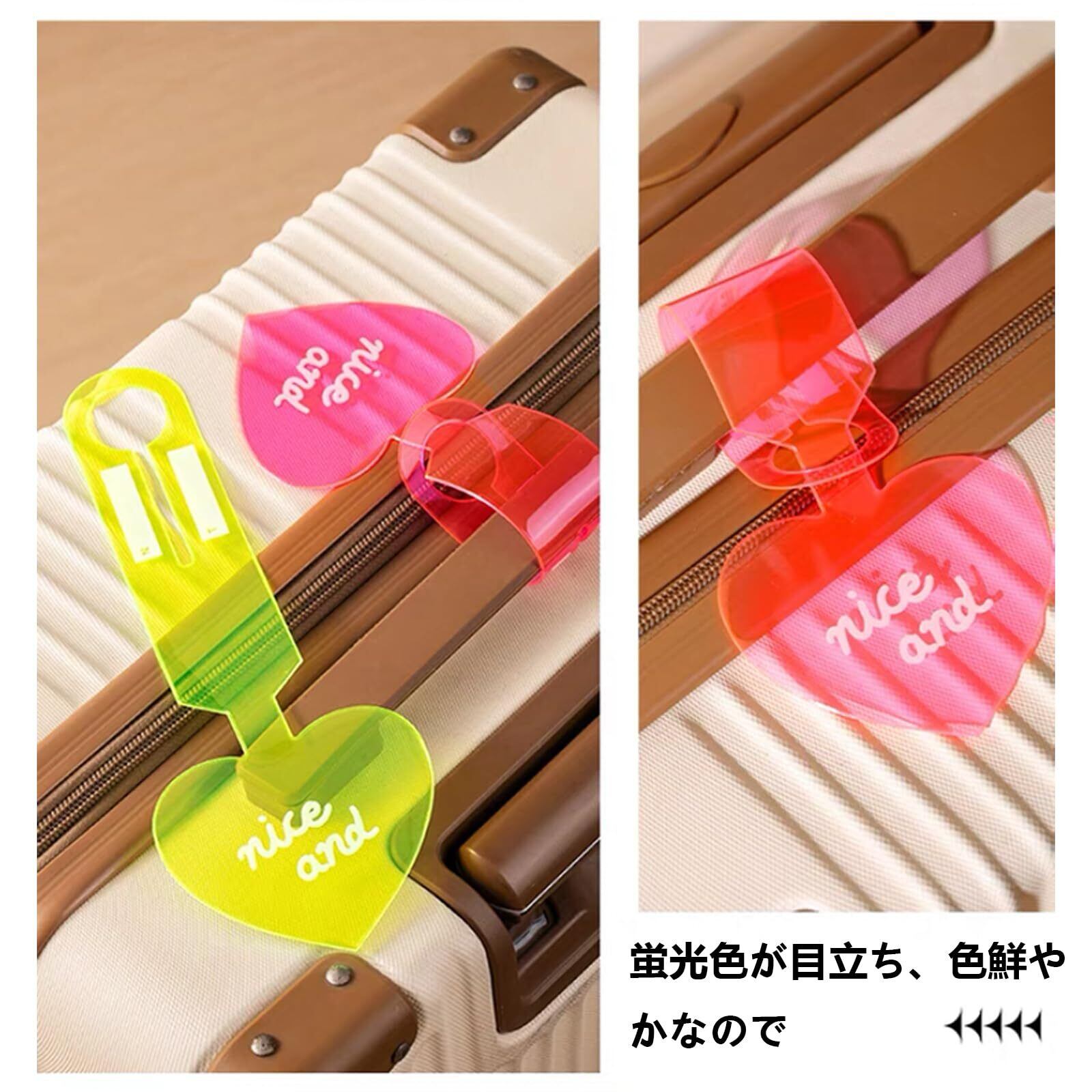 【スーツケースタグ】スーツケースタグは外観はハート型、蛍光色が目立ち、色鮮やかなので、たくさんのスーツケースの中から自分の荷物を見つけやすく、とても便利です。