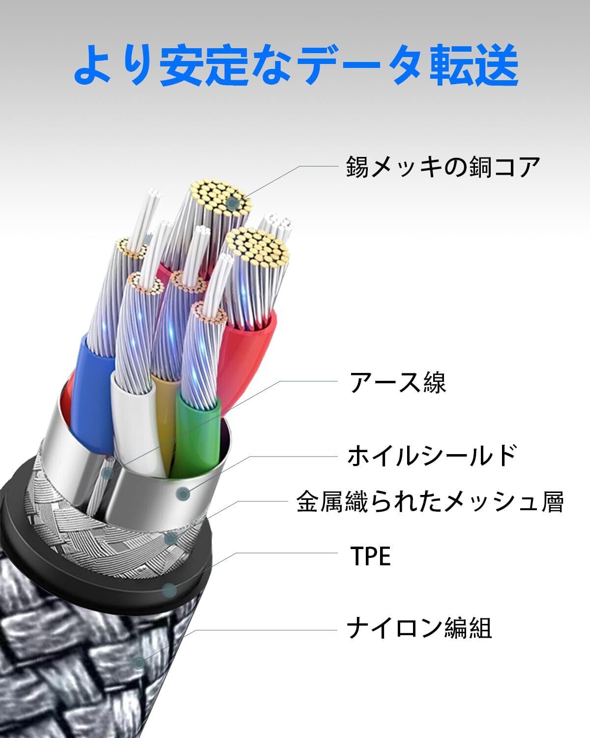 【高耐久性ナイロン編み】高品質ナイロンによるUSBコードの柔軟性が良くて耐久性も抜群です。このusbケーブル a-aタイプは10,000回以上の折り曲げテストでも断線しません。長年に経ってもケーブルの曲げ損傷が防止され、耐久性を強くなります。