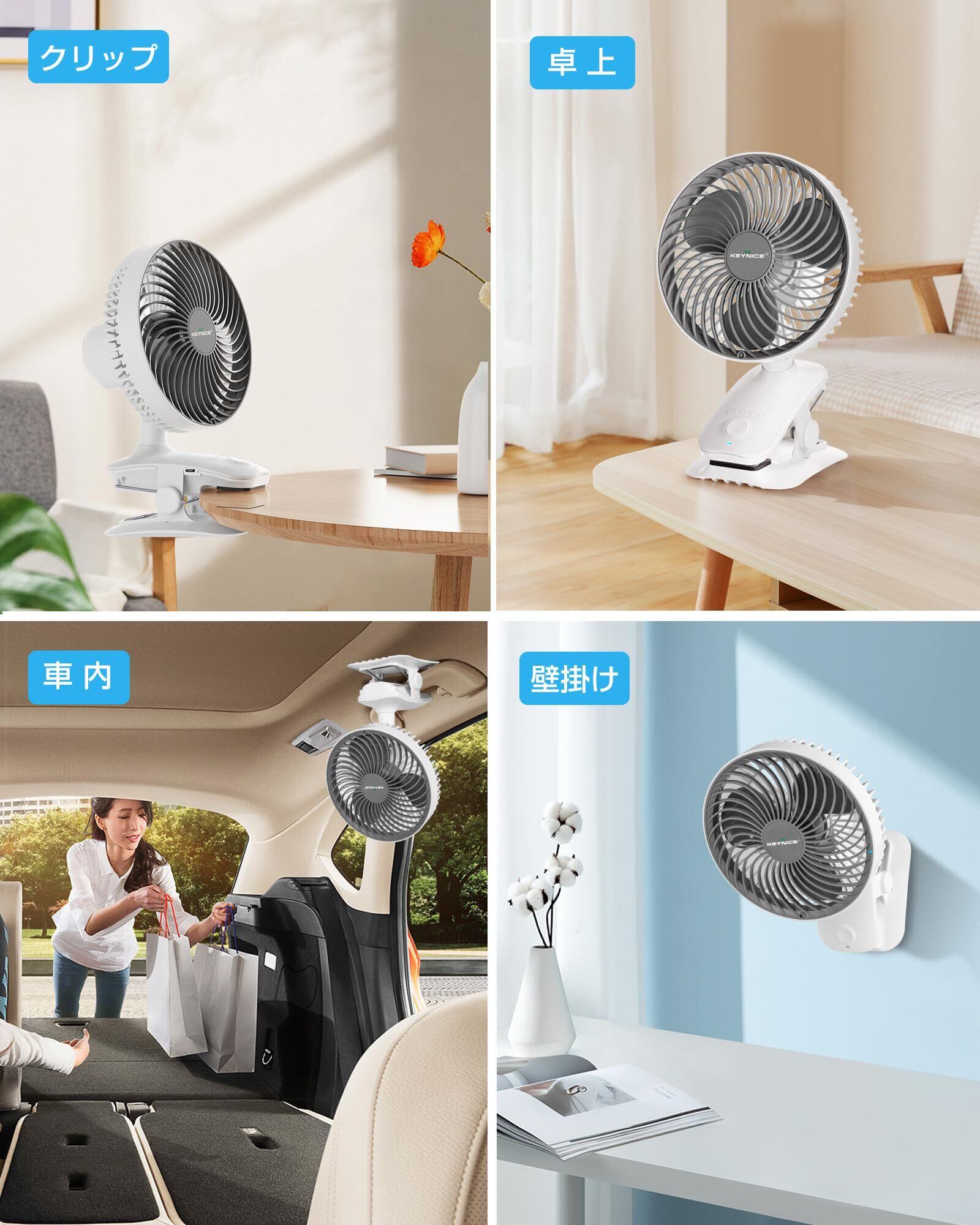 KEYNICE 卓上扇風機 扇風機 小型 クリップ 首振り usb 静音 車 dcモーター 充電式 壁掛け 5000mAh大容量バッテリー ベッド キャンプ リズム風搭載 ミニ扇風機 風量4段階調節 超強風 オフィス 長時間連続使用 ホワイト