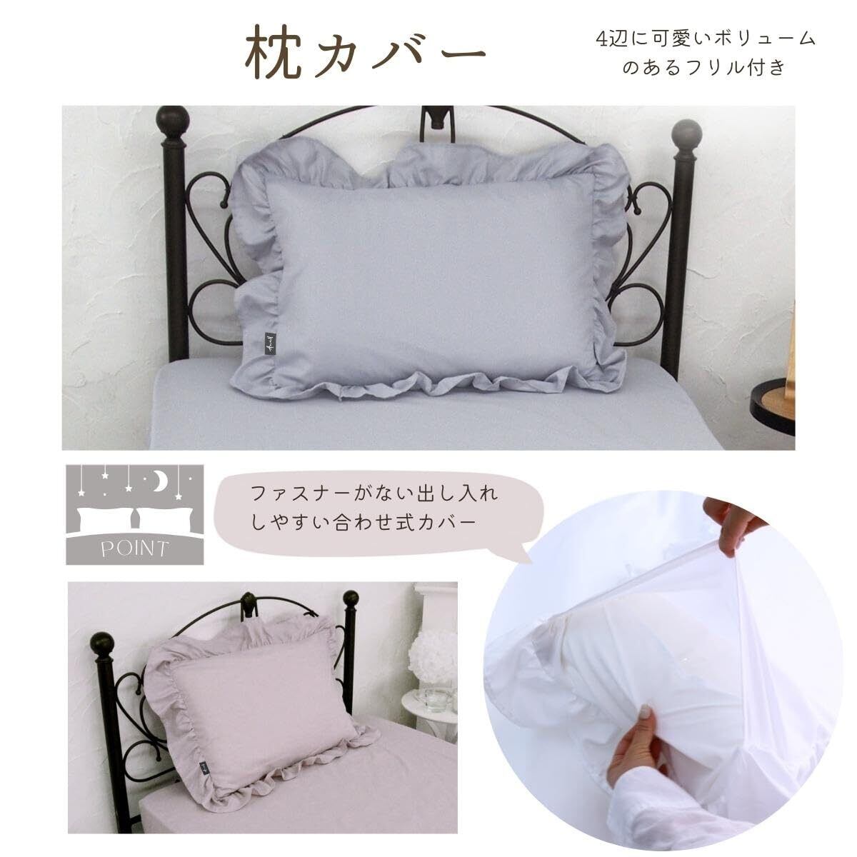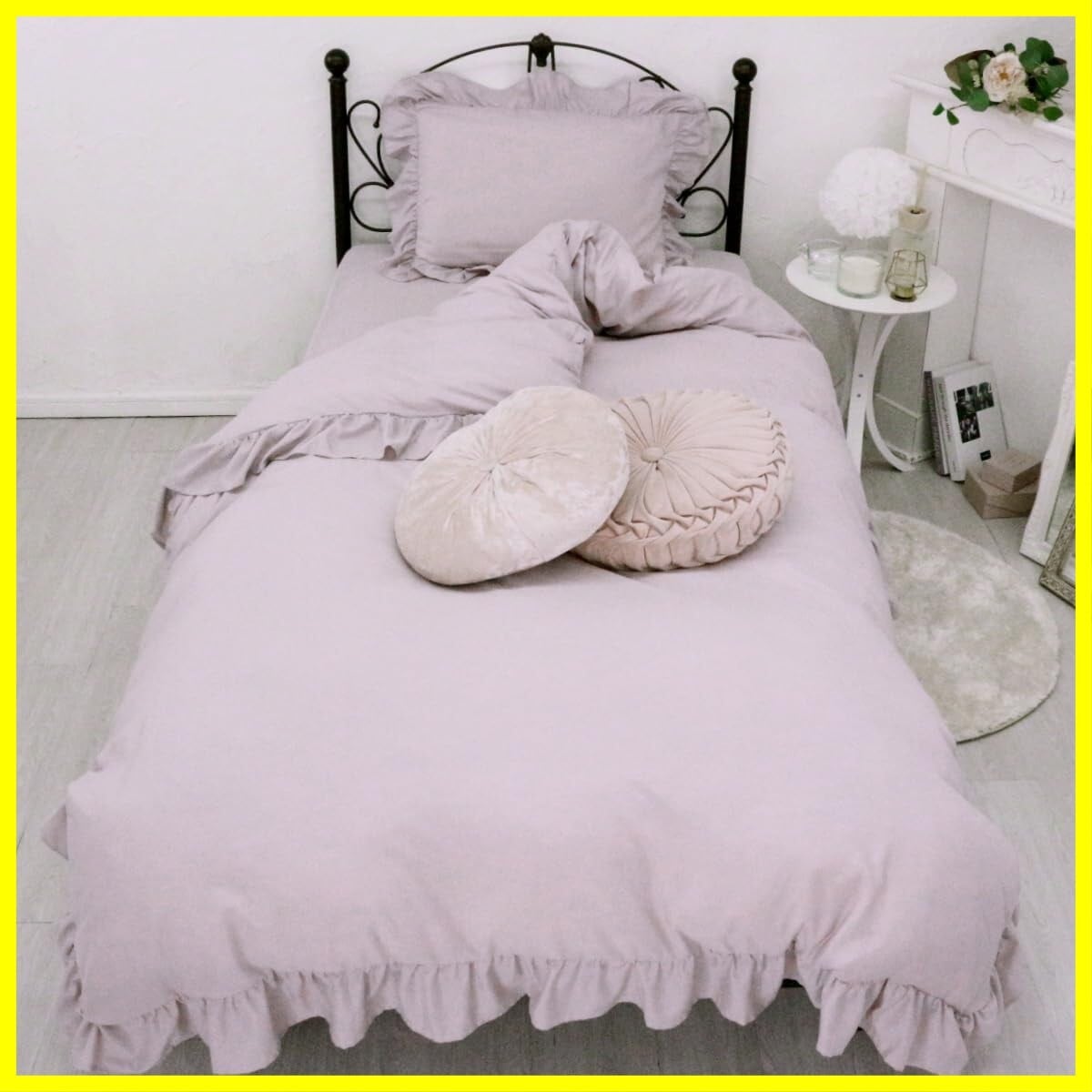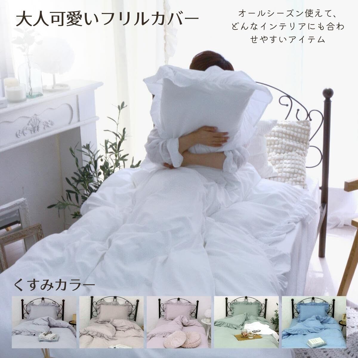 大人可愛いフリル布団カバー。オールシーズン使えて、どんなインテリアにも合わせやすいアイテム。フェミニンなフリルデザインですが、選べる6色のくすみカラーよりあなたのお部屋を、可愛いプリンセス系や、大人可愛い系などに演出。ベット周りから、お部屋の雰囲気を変えてみませんか。 枕カバー、掛布団カバー、ボックスシーツが、各1枚ずつの3点セットなので、統一感が生まれ、お気に入りのお部屋にコーディネート出来ます。 しっとりやわらかな肌触りのピーチスキン加工。洗濯機OKなので、じゃぶじゃぶ洗えて乾きやすい素材。シワになりにくい生地なので、お手入れも気軽で簡単!ご自宅用はもちろん、大切な方へのギフトとしても最適!