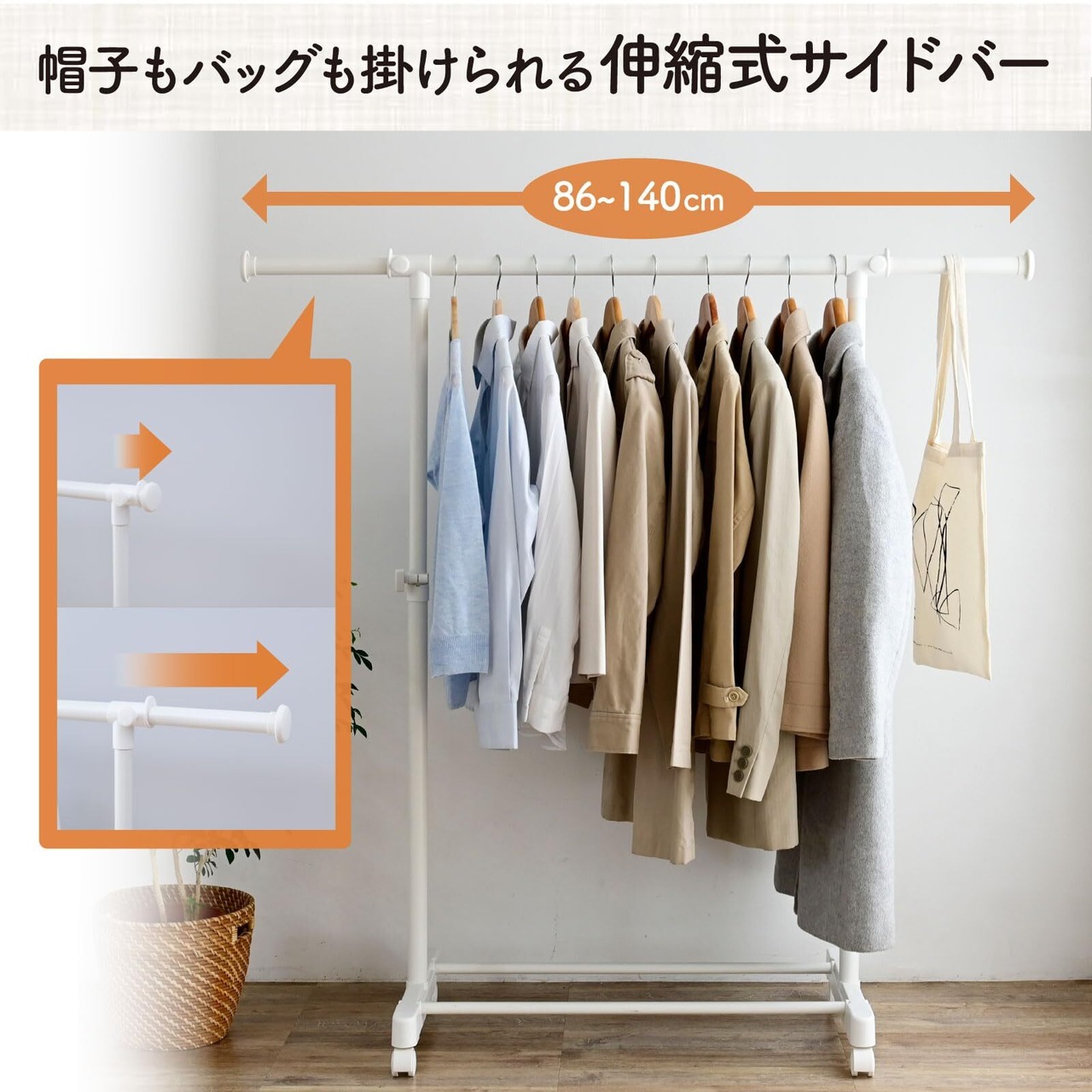 【縦/横伸縮でたっぷり収納】サイドバーが伸びるので、さっと取れるよう毎日使うコートを掛けたり、ネクタイやストール、帽子などの衣類小物の収納にぴったりです※サイドバーの耐荷重:1kg