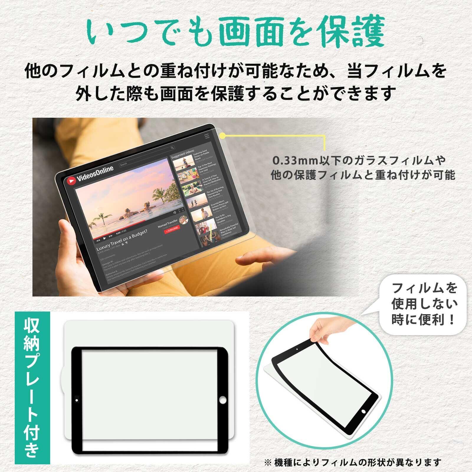 【着脱式】上下左右すべての枠が粘着式で何度でも着脱できる新素材を採用しています。iPadにしっかりと密着するため、タッチパネルの感度が落ちづらく、描き心地も良いです。マグネット式と比べてフィルムがズレる心配がないため、快適にイラストやメモを書くことができます。 動画を楽しみたい時などはフィルムを外すことができるので便利です。 また、外したフィルムに傷やホコリが付かないようにするための収納プレートが付属しています。