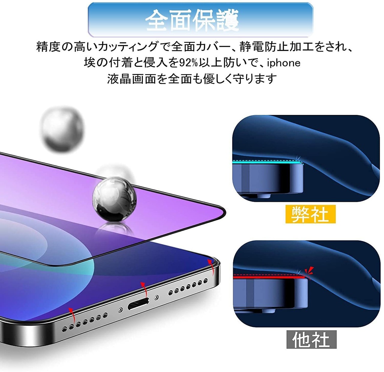 【ブルーライトカット機能】ガラスフィルム は先進ブルーライトカット反射技術によりブルーライトを大幅にカットでき、目に掛かる負担を軽減し、色素沈着を防止、効果的に近視を予防でき。ディスプレイを長時間眺める方に効果を発揮します。優れた保護性能を提供しながらも、透明度が99%以上と高く、通常の液晶保護フィルムよりも透明度が高くなっています。iPhoneスクリーンの鮮やかさやの感度は損ないません。