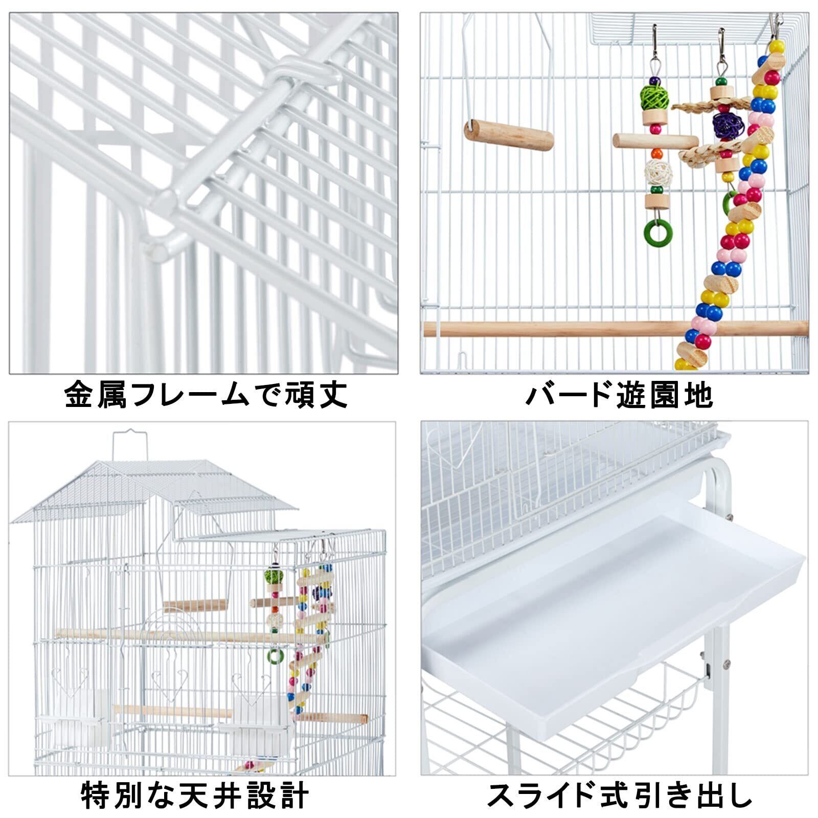 【広々空間で、多用途】この高品質のオウム ケージは、家庭用と業務用の両方にも適しています。この広いスペースと工夫したデザインは、ペットショップや動物病院でも大活躍! この大型鳥かごサイズは46x 35.5 x 99cm(L x W x H)で、ケージワイヤ間隔は1.3cm です。セキセイインコ、カナリア、ラブバード、フィンチなど、多数の小鳥でも飼育できます。