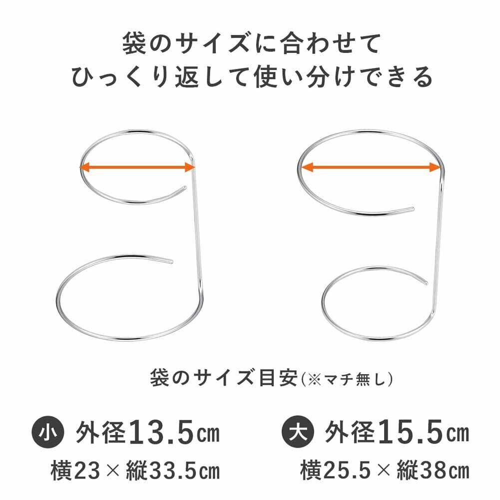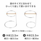 不要になったスーパーの食品用ポリ袋を利用して生ゴミ入れ用スタンドとして便利。サビに強いステンレス製でシンプルで機能的デザインはお手入れも簡単。上下ひっくり返せば、大・小2サイズの袋が使える