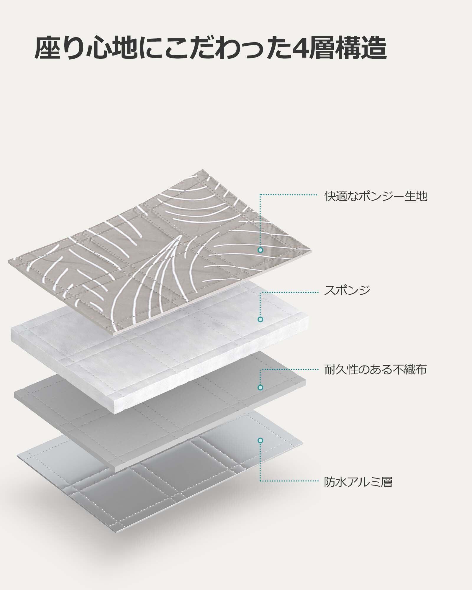 【座り心地にこだわった4層構造】4層構造で地面のゴツゴツ感を和らげてくれます。薄手の生地なので、コンパクトで持ち出し便利です。下地は防水シートなので、座った時の冷たさや暑さなどを緩和してくれて、優しい座り心地で快適です