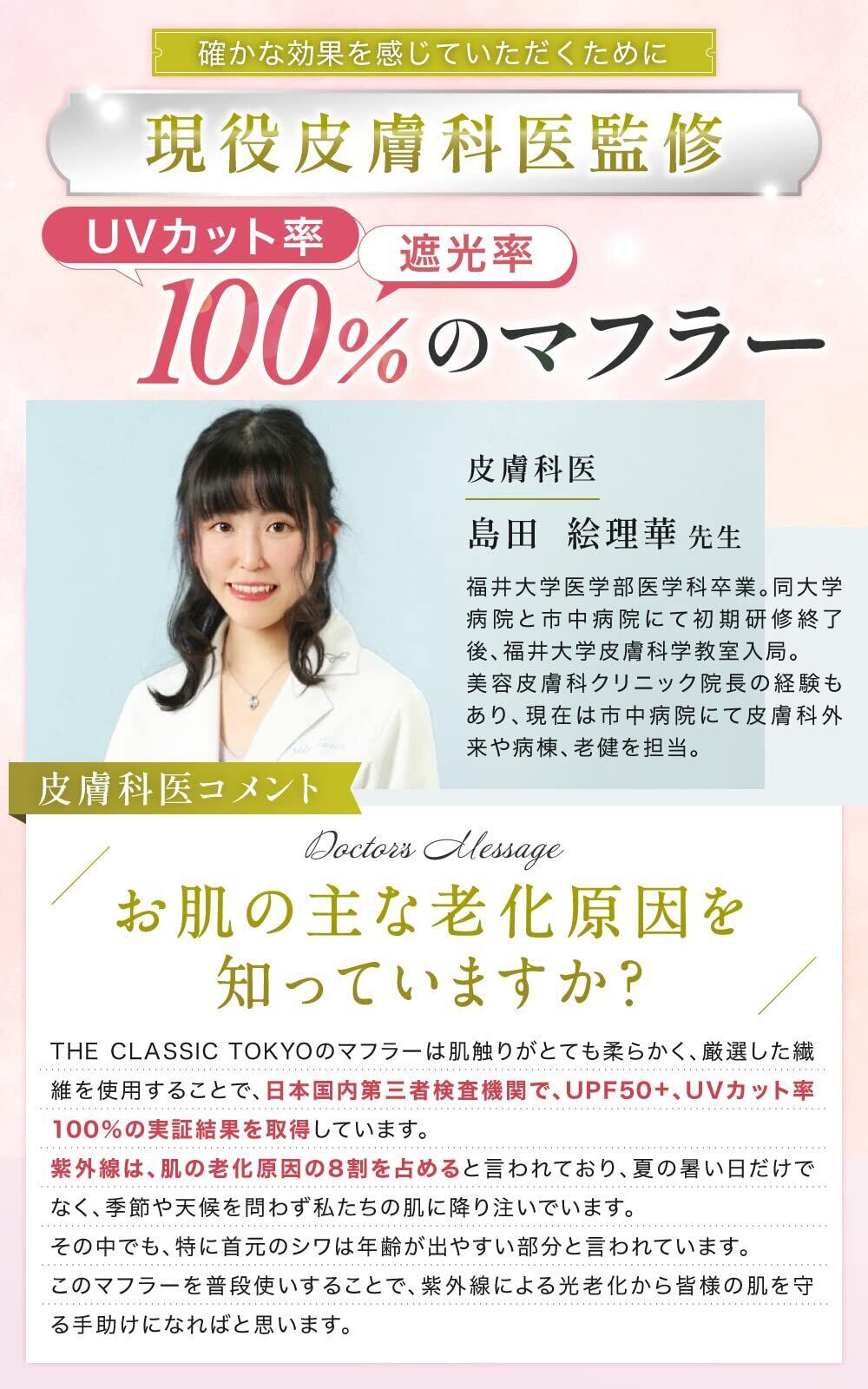 UVケアブランド「THE CLASSIC TOKYO」の肌触りを追求したカシミヤタッチチェックマフラーです。 現役皮膚科医島田先生監修のもと、肌触りの良さを追求した素材構成はそのままに、冬場でも降り注ぐ紫外線からお肌を守るべく国内第三者機関でUVカット率100%の認証結果をいただきました。 大判サイズのため、ご友人の結婚式などストールとしての利用やひざ掛けとしても使い勝手◎ 徹底的に品質にこだわりましたが、少しでもお手に取りやすいようコスト削減のため圧縮袋に入れての配送になります。
