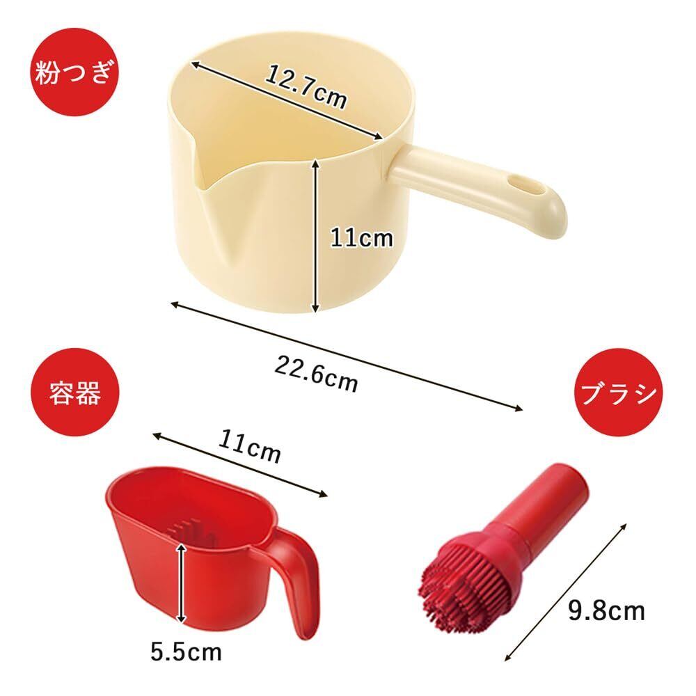 サイズ(約):たこピック/全長18×外径2.1cm、油ひき/幅11×奥行5.5×高さ5cm、ブラシ/径4×全長9.8cm、粉つぎ/幅22.6×奥行15.8×高さ11cm、粉まぜらー/幅2.7×全長19×高さ4.2cm