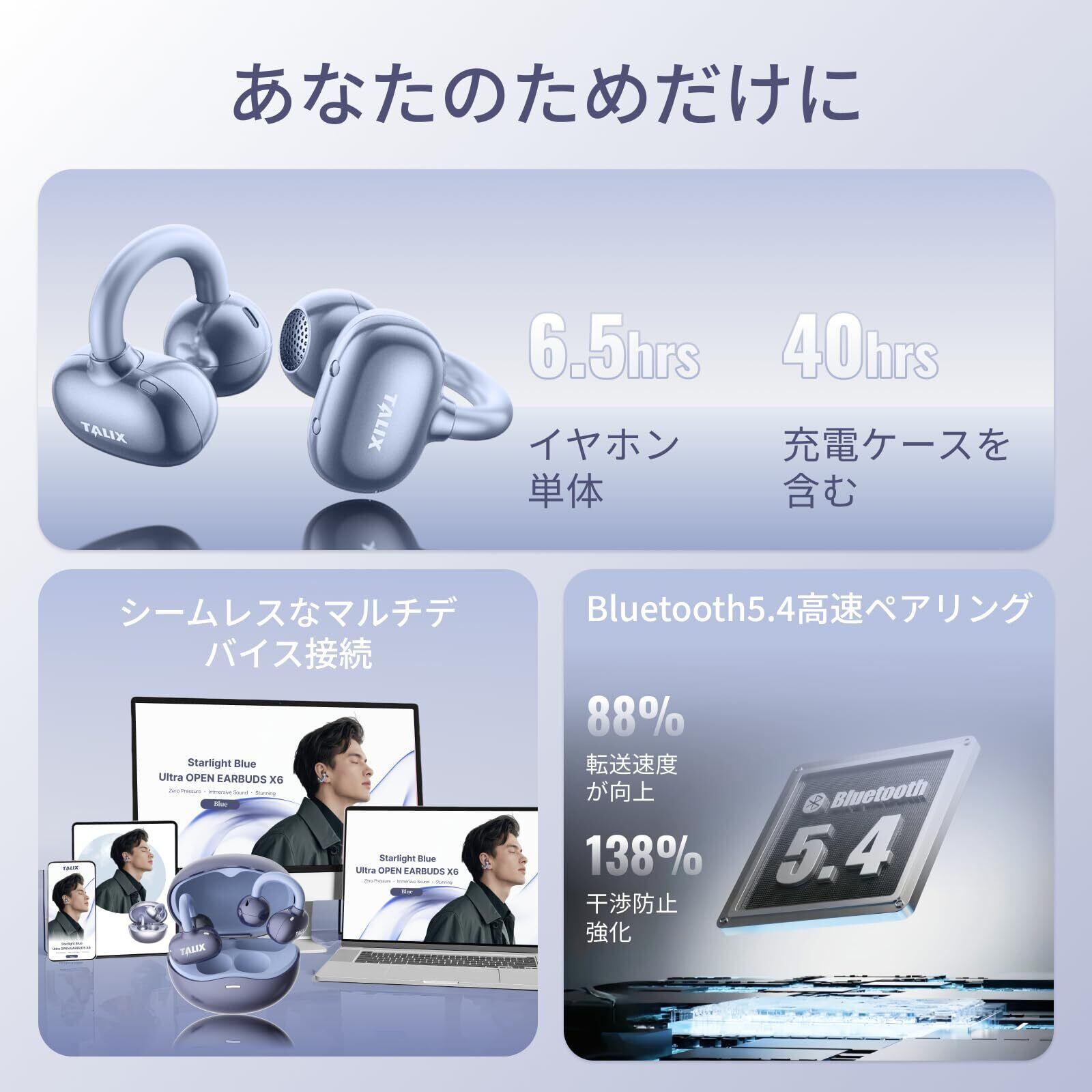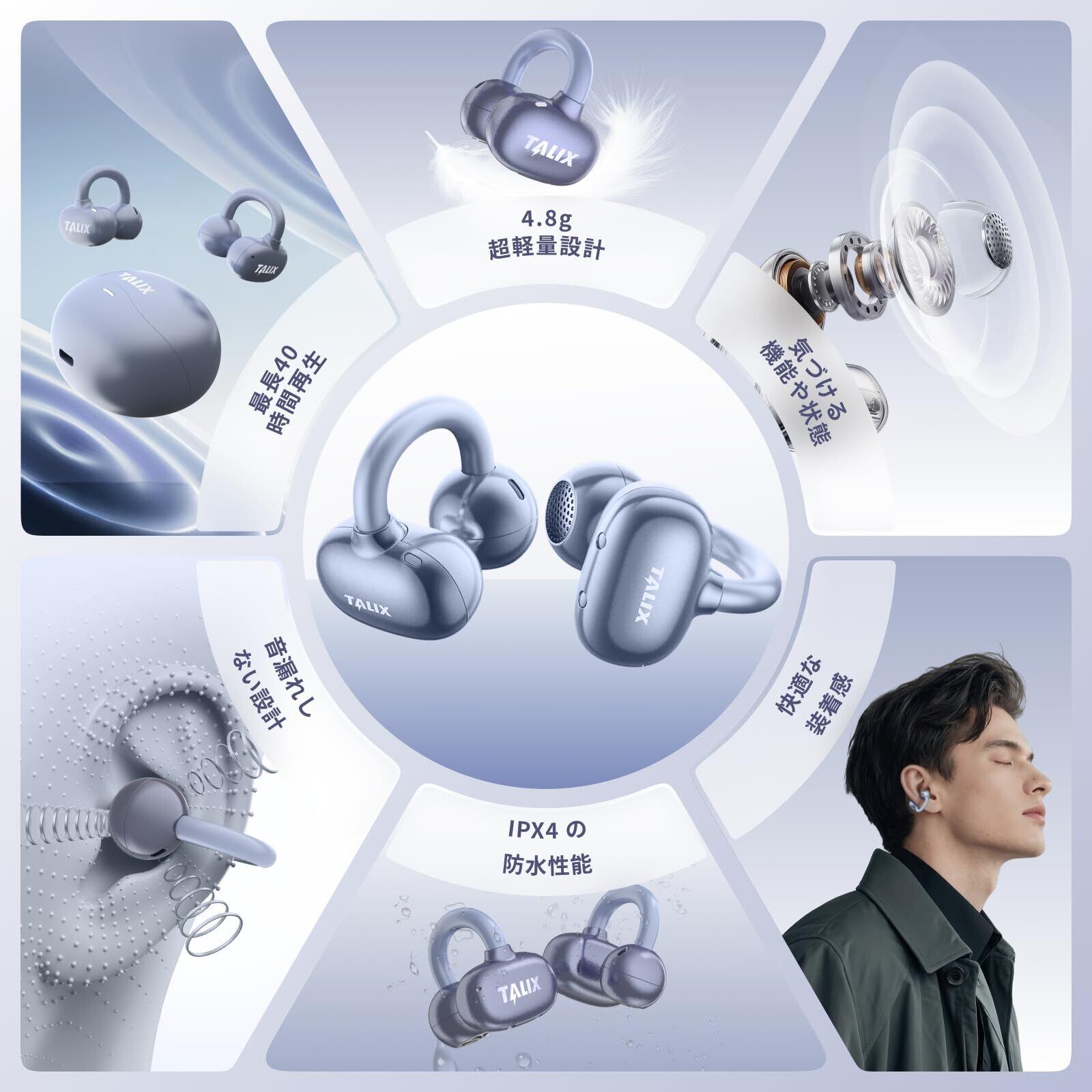 TALIX イヤーカフ イヤホン | ワイヤレス オープンイヤー·超軽量4.8g· 落ちにくい| 音漏れ防止·ENC通話·クリア音質 | 空間オーディオ·マルチペアリング接続 | Bluetooth 5.4·急速充電·最大40時間再生·空気伝導技術 | IPX4防水·スポーツ/通勤対応 | Ultra Open Earbuds X6 タリックス(ブルー)