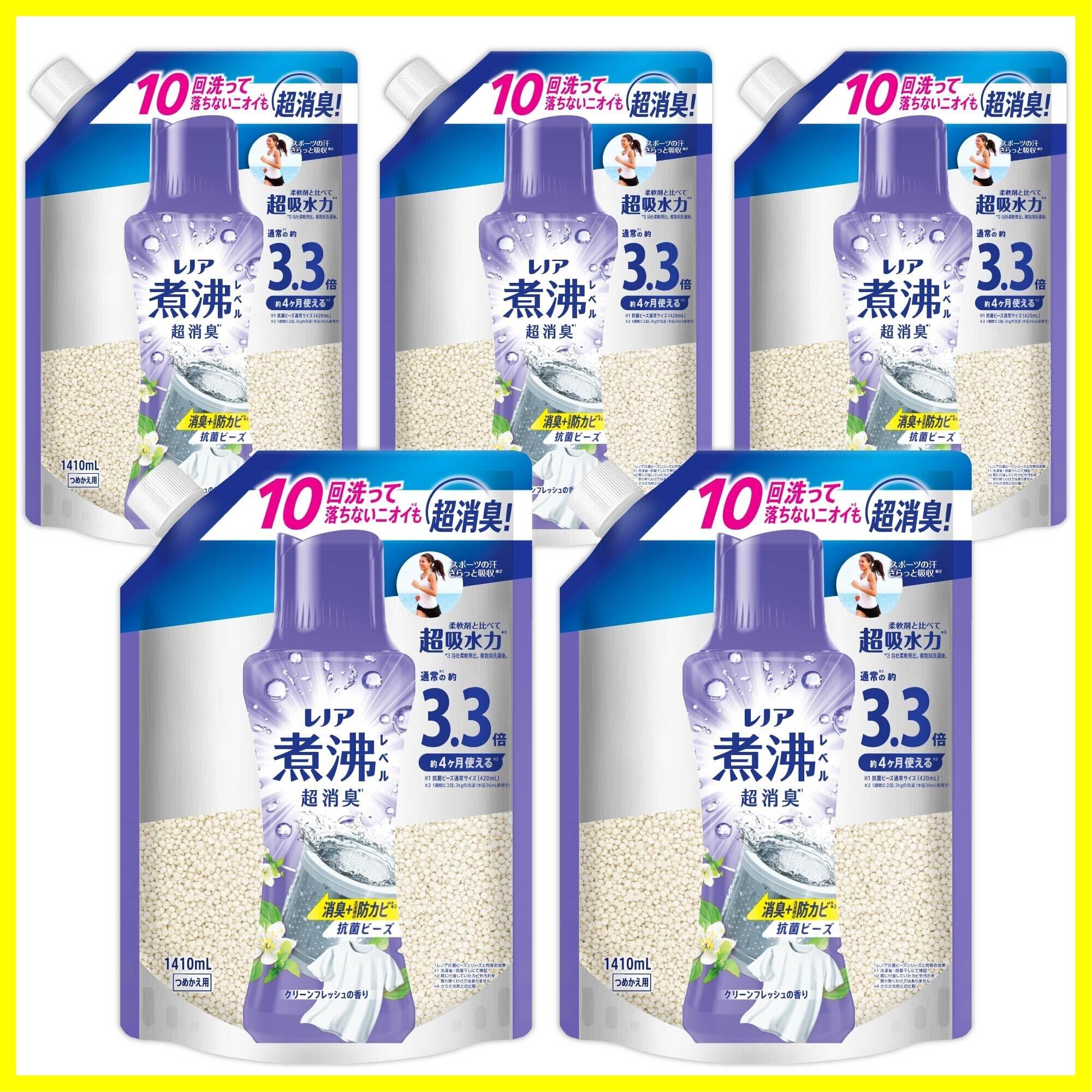 レノア 煮沸レベル消臭 抗菌ビーズ 消臭+防カビ クリーンフレッシュ 詰め替え 1,410mL×5袋 [大容量] [ケース品] 柔軟剤と一緒に使って効果長続き