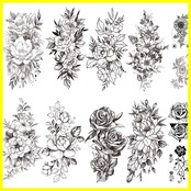 【セット内容】タトゥーシール 花 黒 バラ 薔薇 12枚セット、大柄8種類各1枚、小柄4枚。