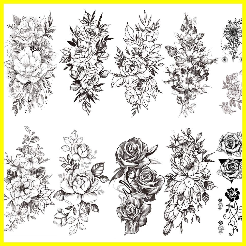 Yesallwas タトゥーシール 花 黒 バラ 薔薇 12枚セット 入れ墨シール リアル 防水 長持ち 刺青シール ボディーシール メンズ レディース black rose flower temporary tattoos 11.5x21CM