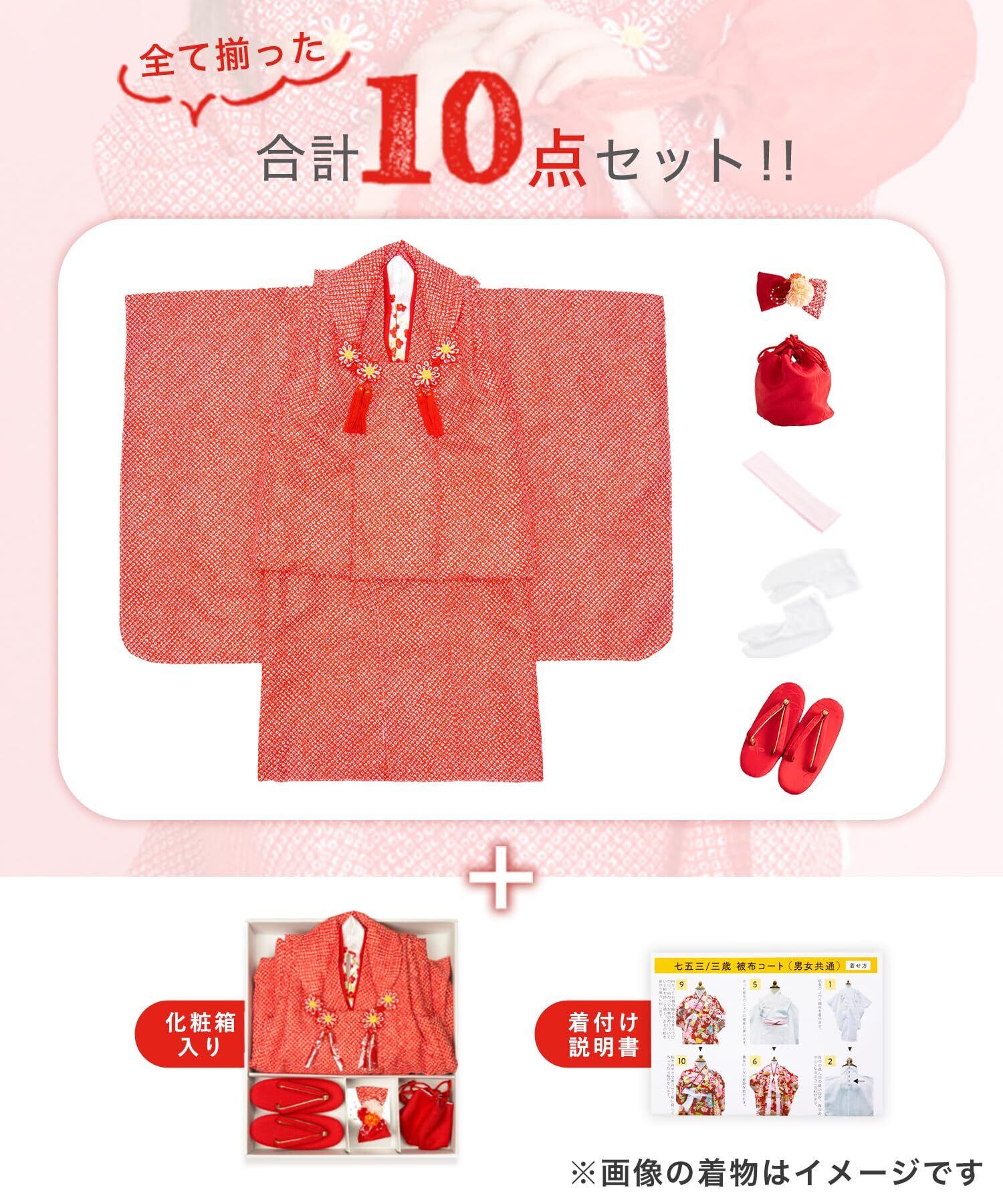 七五三のお参りにぴったり。3歳女の子の被布セットです。髪飾りや巾着、草履など含めて9点のフルセットなので、これだけで必要なものがすべて揃います。はじめての方でも簡単にできる着付けの説明書をお付けいたします。