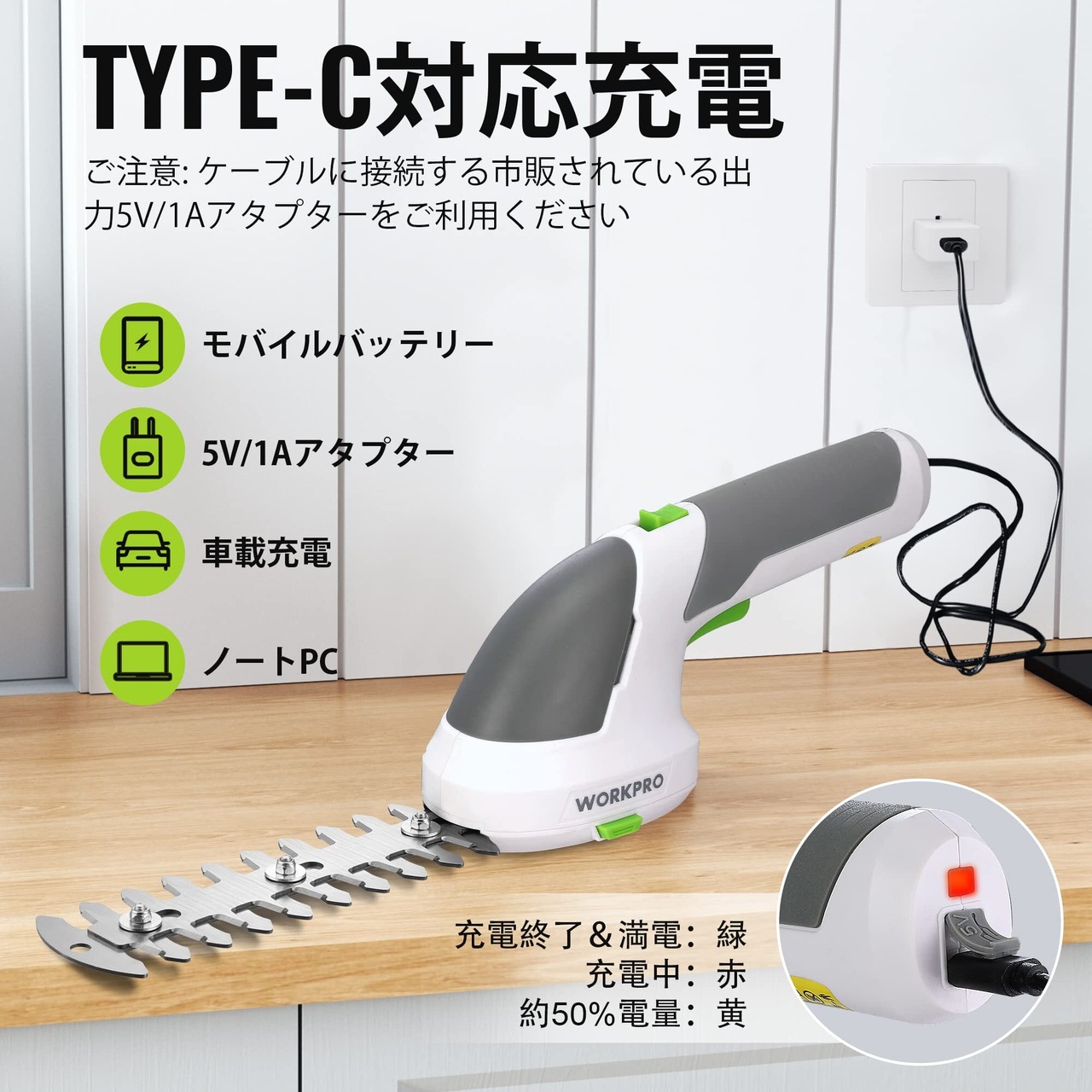 【効率向上7.2V充電式】7.2 V強力バッテリに全新進化、無負荷運転時間80分使用可能になります。コードレスタイプなので、コードが絡まったりひっかかる心配もなく、様々な場所で使用できます。USBケーブル(Type-C充電ポート)が付いて、ノートPC、車載充電などに対応充電できます。それに、普通の市販されているアタプター(5V/1A)にも接続して、充電ができるので便利です。フル充電の時間は約2-3時間です。充電が完了するとインジケーターライトが緑色に点灯します。ストローク数は一分1100回、剪定の効率が向上になります。ご注意:USBケーブルに接続する市販されている出力5V/2Aアタプターをご利用してくださいませ、(アダプター出力5V/1A)足りない場合、充電ができなくなります。出力電圧が過電圧保護動作値(アダプター出力5V/1A)を超えた際に、過電圧保護回路が動作し、出力を停止させ、充電ができなくなります。