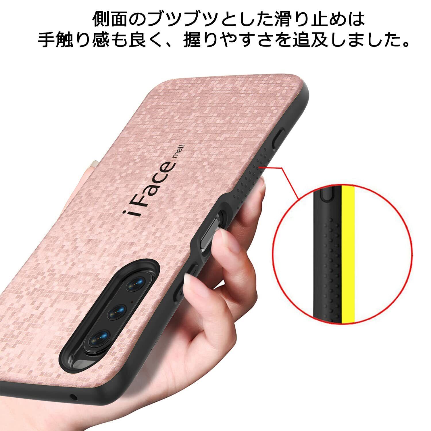 【手触り感の良い素材】高級TPUとポリカーボネートの組み合わせで今までにない高級感と美しさを実現しました。弾力性と耐久性にも優れているので、長くお使いいただけます。背面はつるつるとした手触りです。側面にはブツブツとしたゴム素材の滑り止めが付いていますので、しっかりとした握り心地で手触り感も抜群です。濡れた手や乾いた手、どんな手で触っても滑り止めのグリップ感で、スマホを落としにくい設計となっています。