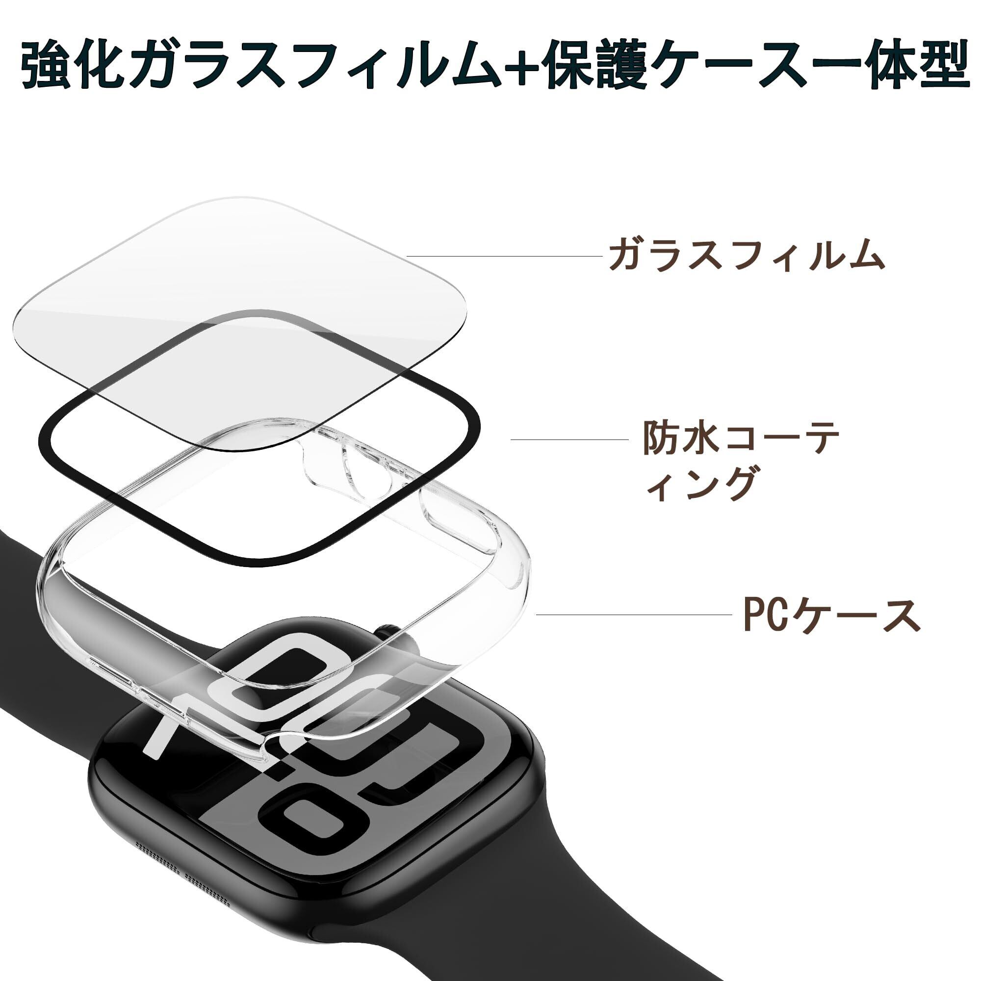 【Apple Watch 10/11防水カバー+ガラスフィルムの一体型デザイン】傷に強く耐衝撃性も兼ね備えたPC(ポリカーボネート)素材によるフレーム部と、硬度9Hで強靭な強化ガラス素材による液晶部の保護フィルムからなる2重構造です。