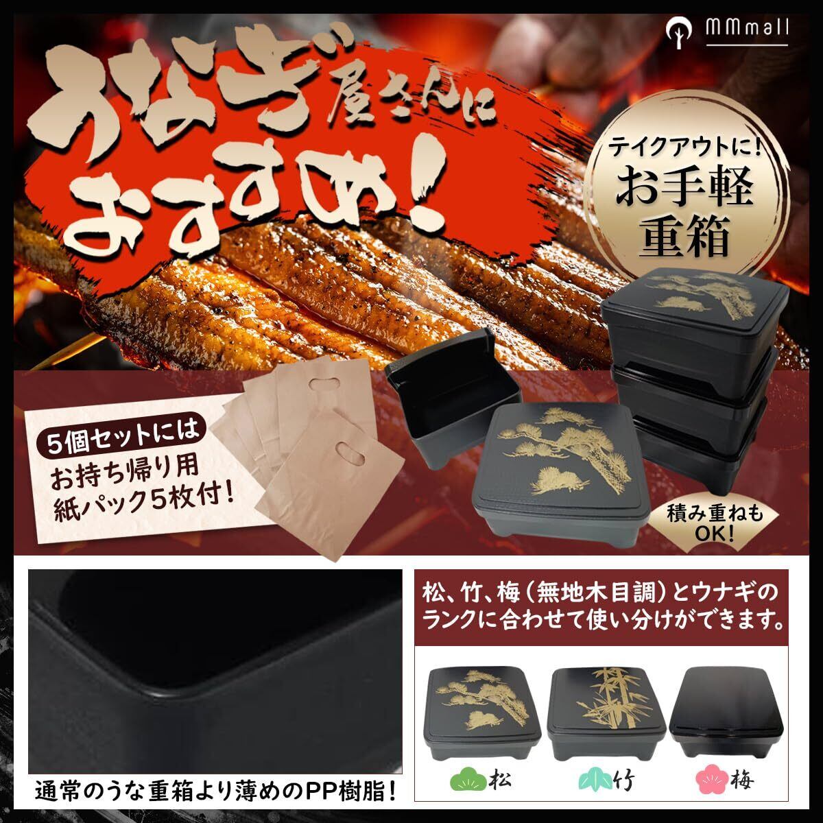 【業務用としても‼️】通常のうなぎ重よりも簡易な作りのPP樹脂素材。ちょっぴり豪華なテイクアウト鰻重としてお使いいただけば、お客さんの満足度も高まります。5個セットには便利な持ち帰り紙パック付きです。