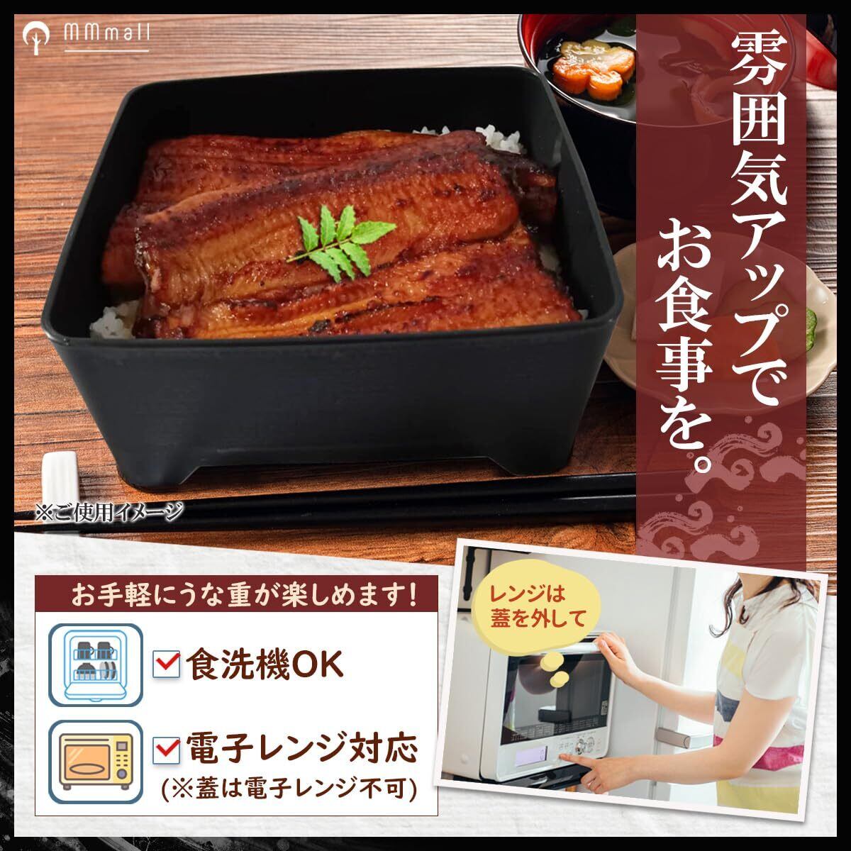 【通常のうな重を家庭用、テイクアウト用にアレンジした商品です】 商品サイズ 162mm×143mm×H75mm 重さ 約150g 蓋部分 ABS樹脂 本体 PP樹脂