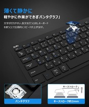 【薄型軽量ながら高い耐久性を実現】 サイズは29cm×12.5cm×1.8cm、重さ約290g、外枠がスリムな薄形コンパクト設計で持ち運びに最適です! さらに、300万回を超えるタイピングテストを行い、耐久性を実証します。薄型軽量ながら耐久性にも優れた薄型無線キーボードを実現します。 キータイプには、ノートパソコンのキーボードと同じ、軽い力で打鍵できる「パンタグラフ方式」を採用しています。