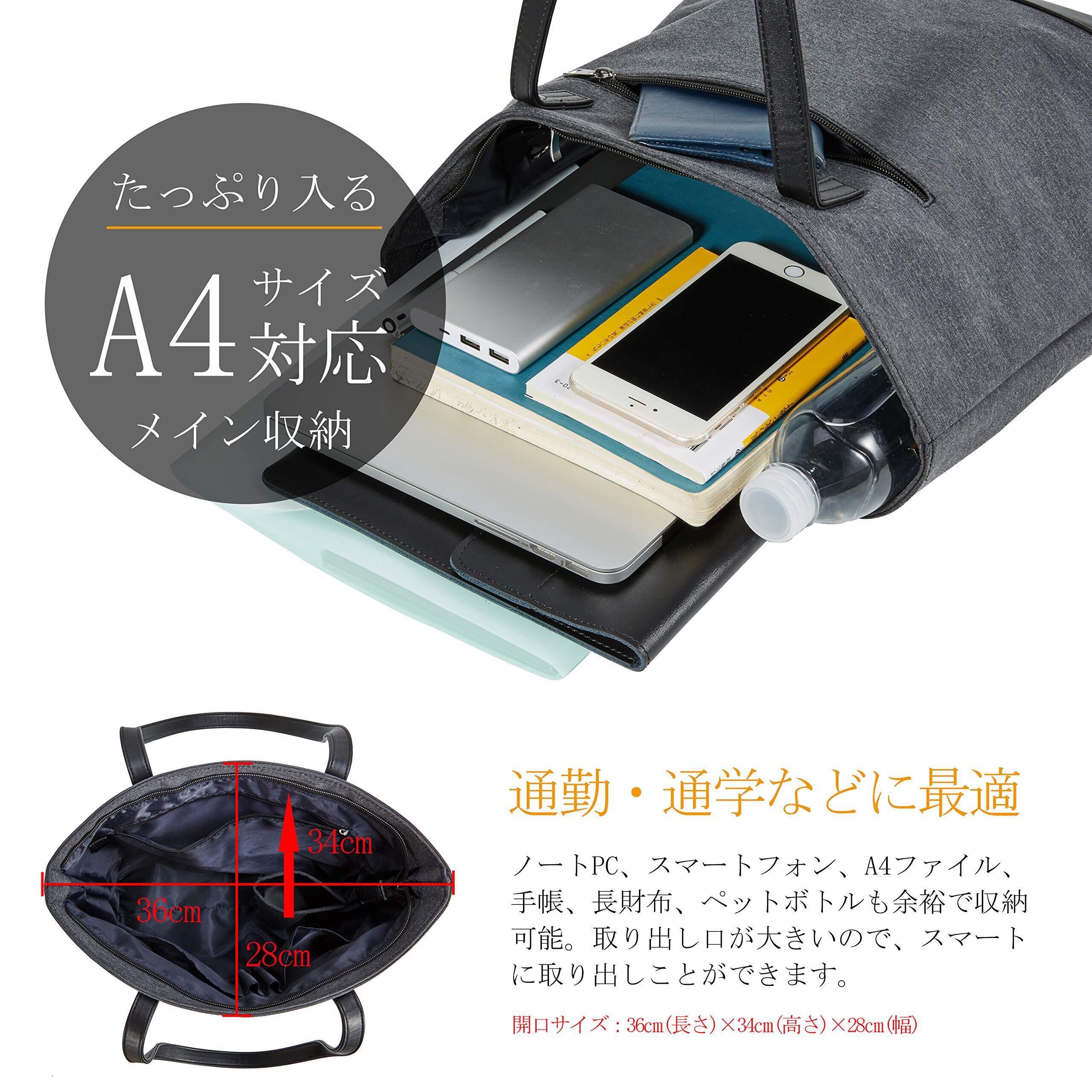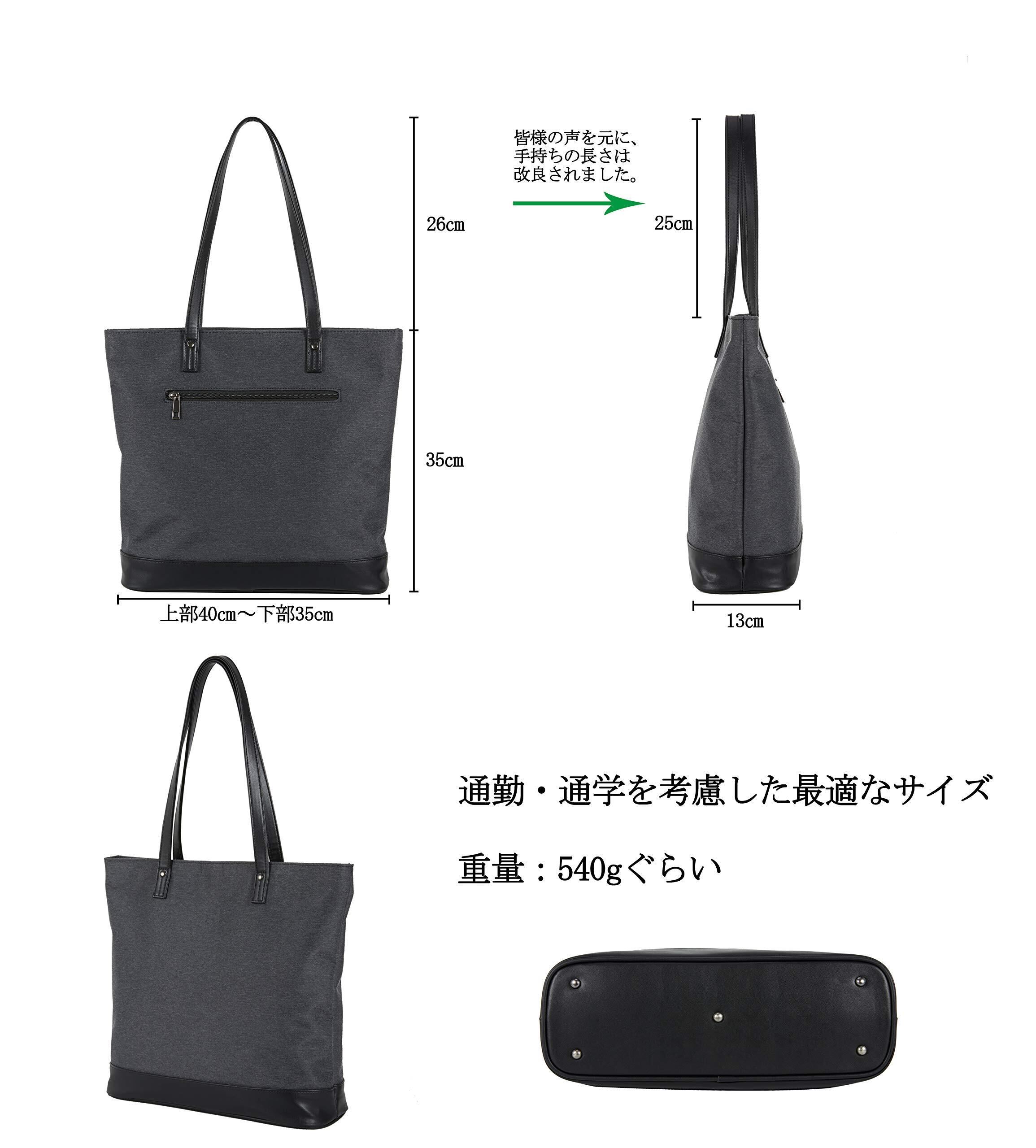[たっぷり収める収納力で仕事をサポート]A4ファイルやノートPCが楽に収納できる、余裕のキャパシティ。マチのあるので、上着やお弁当など、かさばるものもすっきり収納します。中にはオーペンポケット2つとペン差し2つ、ファスナーポケット1つを用意し、携帯やハンカチなどの細かいものも整理がしやすい設計に。口が大きく開くファスナーで、中の荷物の出し入れもスムーズにできます。