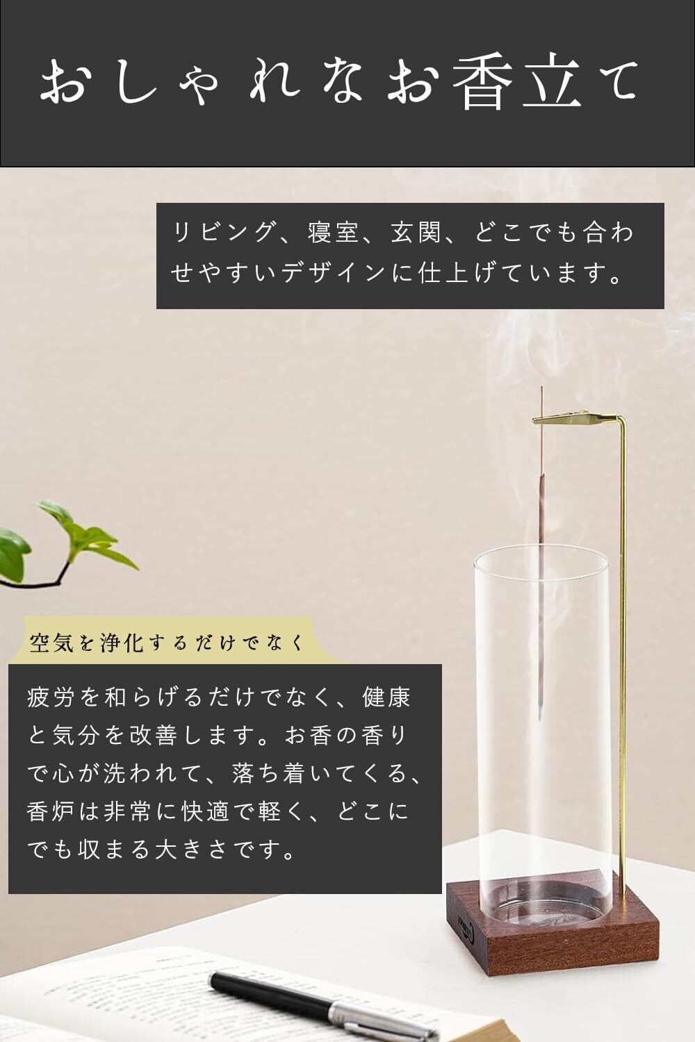 【おしゃれなお香立て】リビング、寝室、玄関、どこでも合わせやすいデザインに仕上げています。透明で美しくガラスと木目調を組み合わせて作られた、モダンな雰囲気で、和室にも洋室にも合うお香立てです。インテリアとしても飾られ、和やかな雰囲気を与えられます。自宅、旅館、仏堂、茶室、居酒屋、図書館、瞑想室、御手洗い、ティーハウス、オフィス、リビングルーム、ヨガなどで、さりげなく香りがする場合に広く使われています。