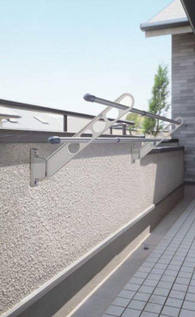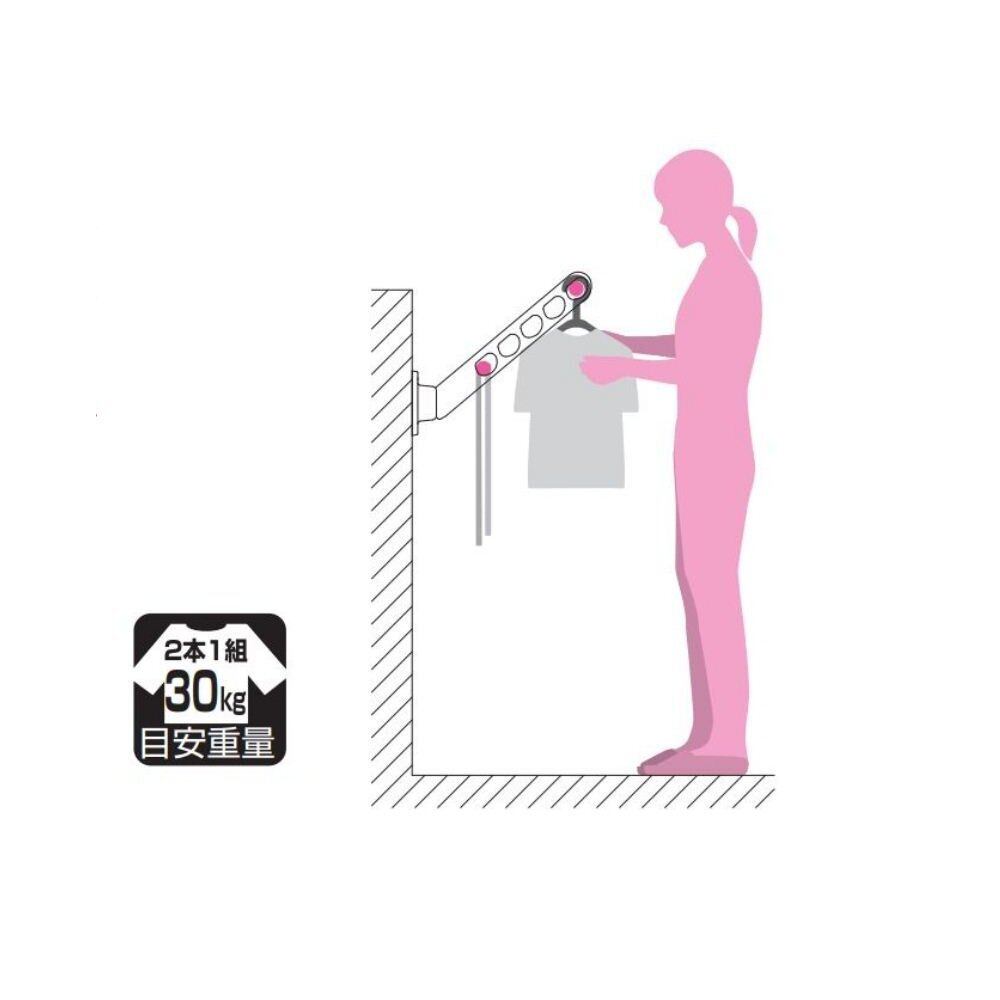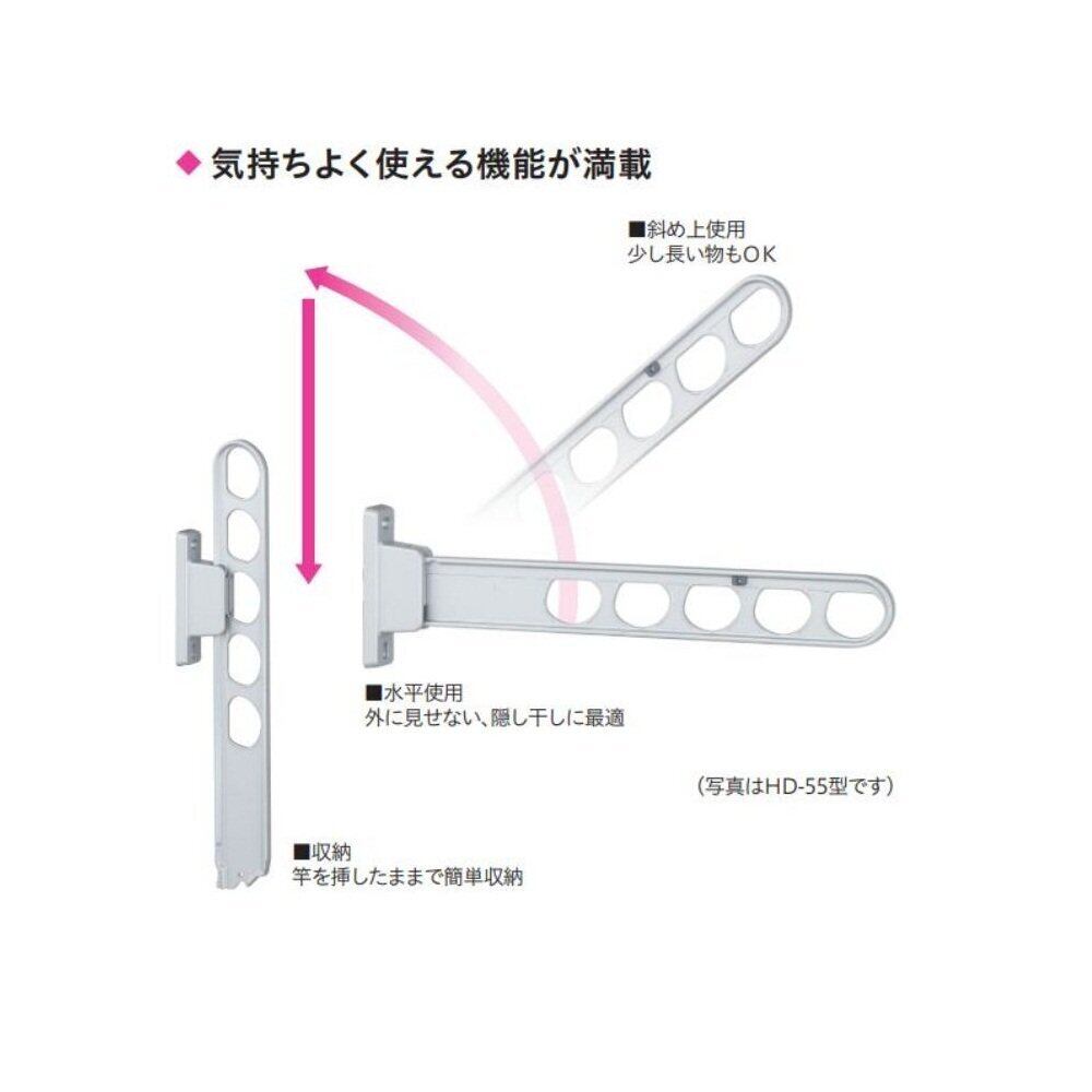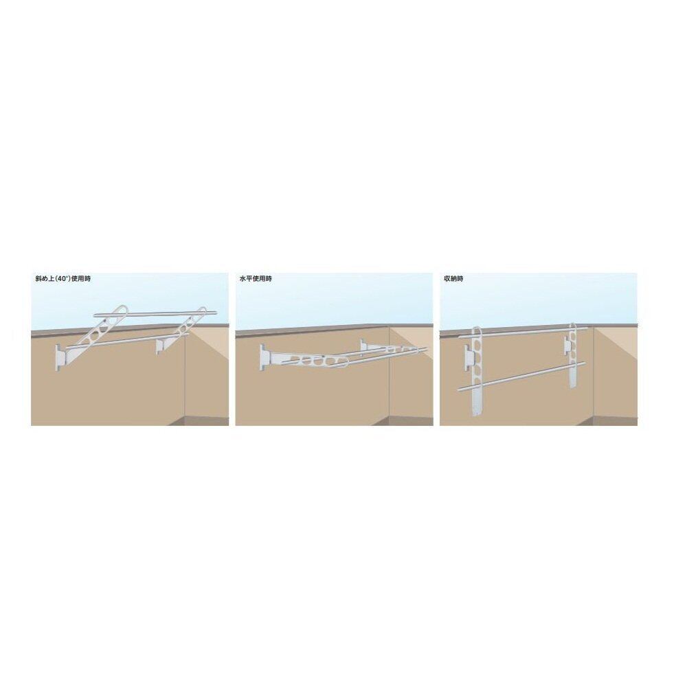 仕様:低い位置に洗濯物が干せる腰壁用物干し。3段活用で角度調節可能(水平-斜め上40°-収納)。収納したときに竿の位置を高く保つことができる「振り上げ収納」を採用。※取付パーツ付属無し。