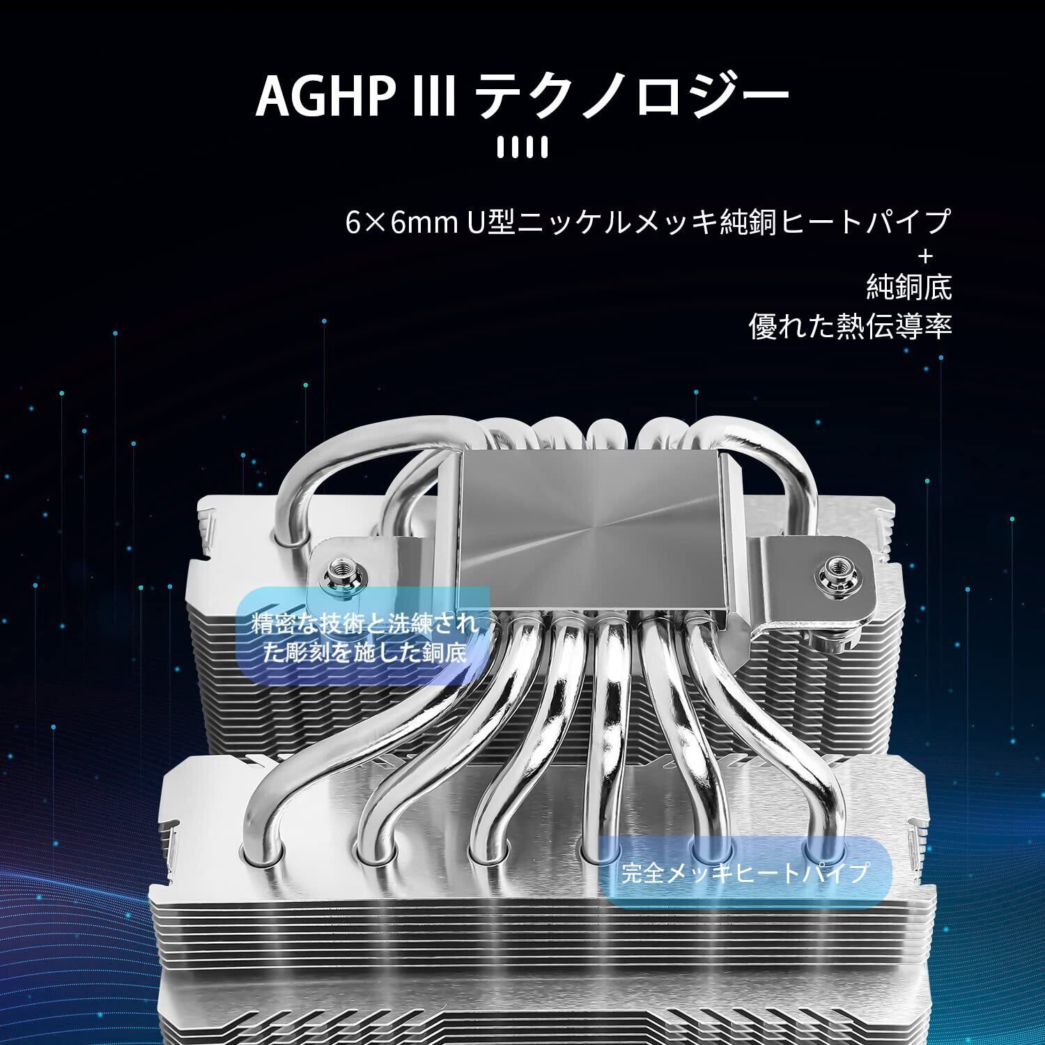 【AGHP技術】6×6 mmヒートパイプはAGHP技術を用いて,垂直/水平方向による逆重力効果を解決し,cpuヒートシンクTDPは120〜245 Wであった。6本の純銅焼結熱管&PWMファン&純銅ベース&全めっき還流溶接技術、CPUヒートシンクが作動する時、超静音気流ファンを組み合わせて、極致のCPU放熱性能を達成することを目的とする