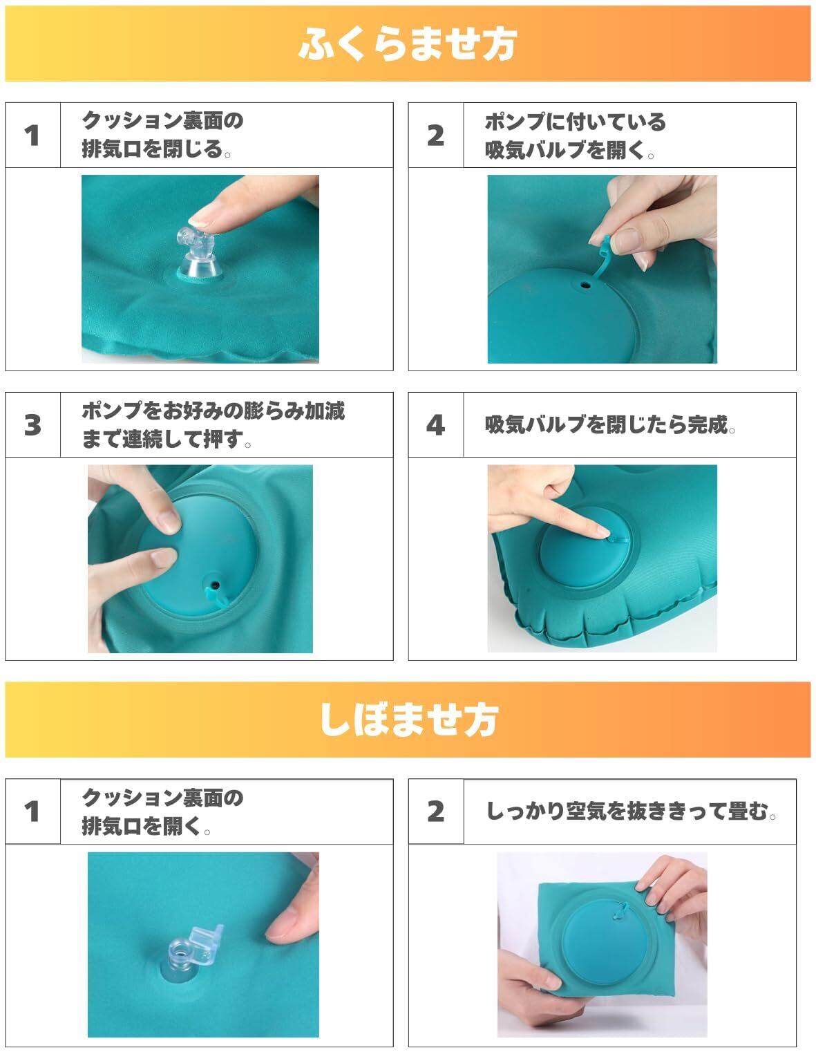 【簡単&衛生的】クッション本体に一体型ポンプが内蔵されており、ポンプを押すだけで簡単に膨らませることができます。また、口をつけて膨らませる必要がないので衛生面でも安心して使用することができます。