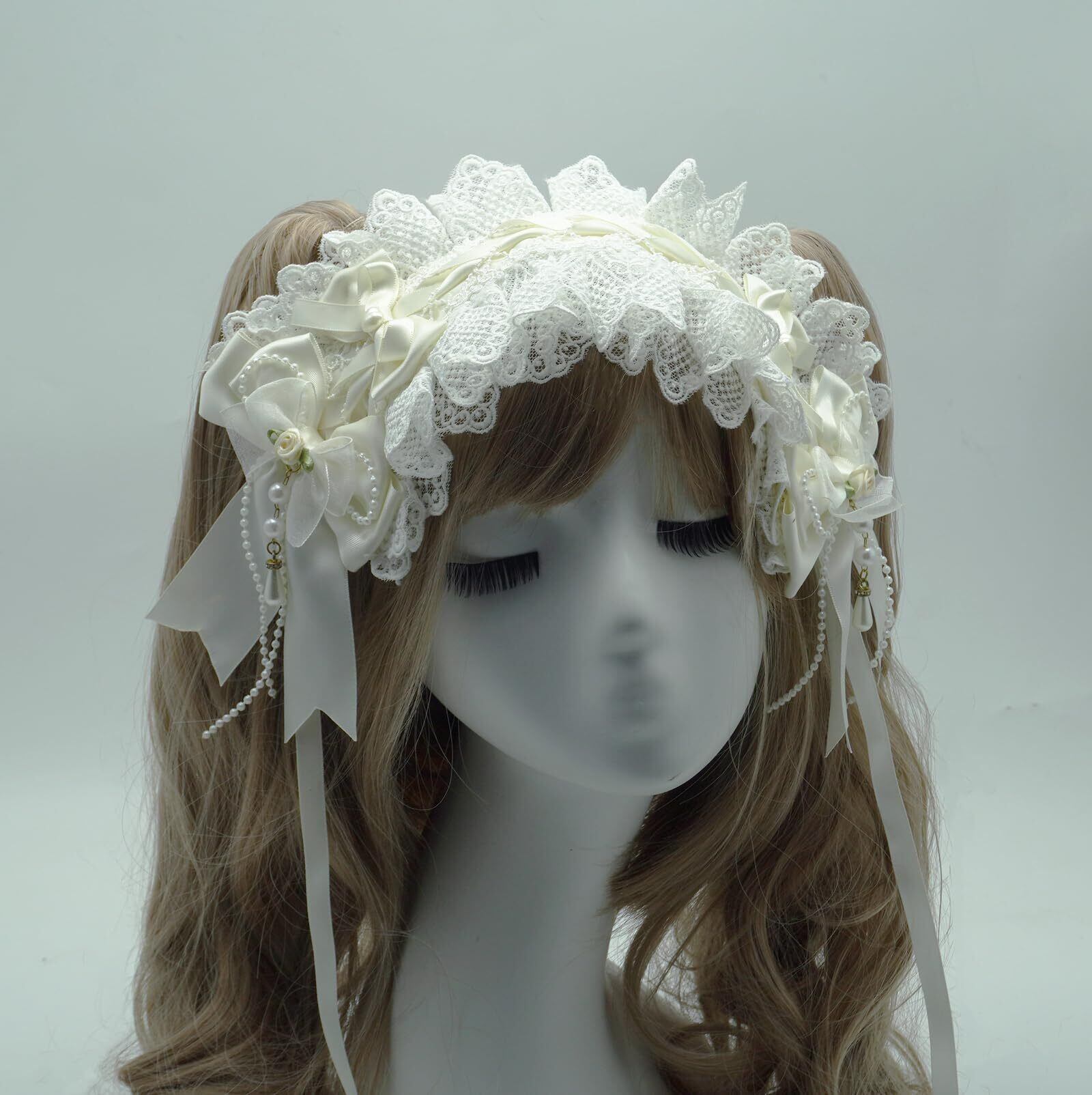 手作り ベビー コスプレ カチューシャ。頭飾りの後ろに2つの隠されたヘアピンがあります。 光沢のあるリボン、絶妙な手作りのビーズチェーン、手作りの小さなバラ、かわいいダブルボウ、レース、繊細なアイボリーホワイトのトリムで縁取られた甘いロリータヘアアクセサリー。