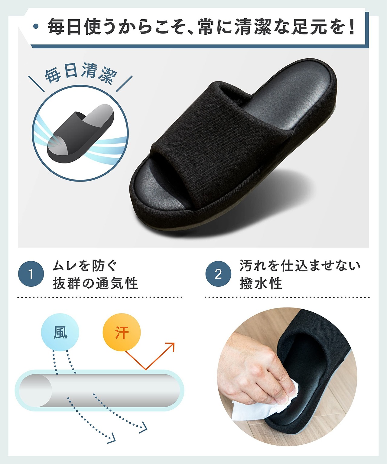 【衛生管理を徹底した抗菌加工!】抗菌加工が施されているため、清潔さを保ちながら安心してご使用いただけます。室内での足元の衛生が気になる方にも最適です。毎日のご使用でも、気持ちよく過ごすことができます。