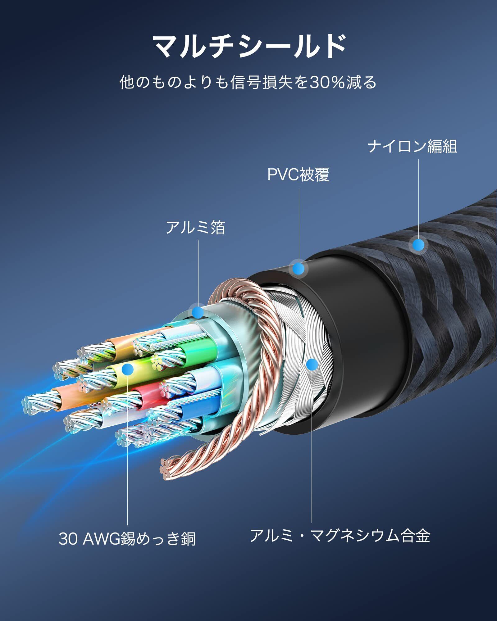 【耐久性 安定性】 このDP ケーブルは、ナイロン編みを使用して耐久性を強化し、配線時の取り回しがしやすく、テレビやレコーダーの裏など狭い場所でも柔軟に配線できるように設計されています。サビに強い24Kの金メッキコネクタを採用し、10000回の脱着テストをクリア。経年変化による信号劣化の心配が少ないため、ディスプレイケーブルとして安定した性能を発揮します。